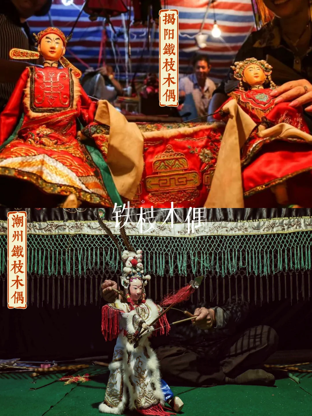 🔸此外,还有由皮影戏演化而来,三支铁丝控制的铁枝木偶,以揭阳和潮州两地闻名。