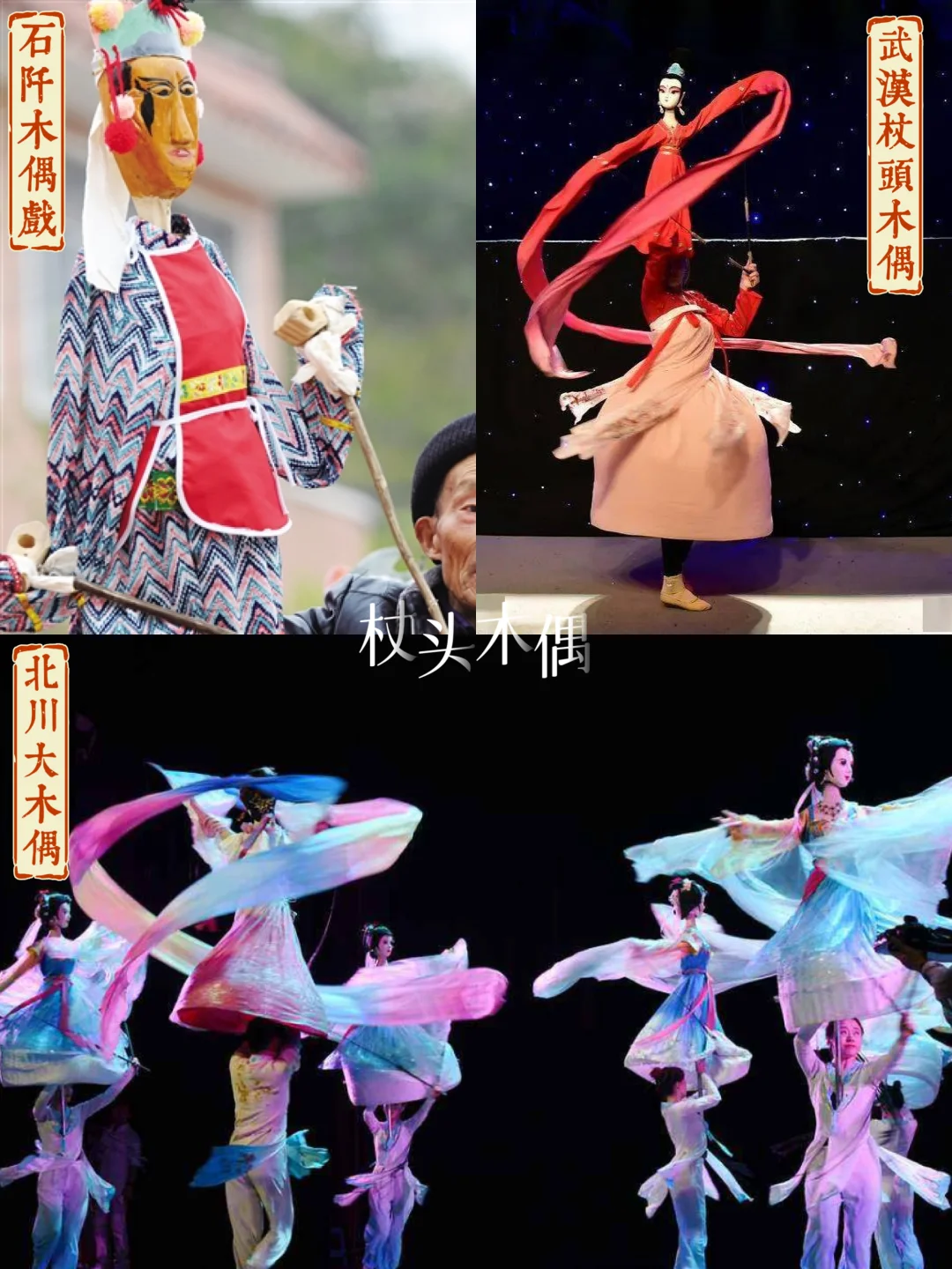 清代有身高1米4,四只灵活可舞刀的川北大木偶,色彩鲜艳、制作考究的石阡木偶,能表演长袖舞的武汉杖头木偶等。