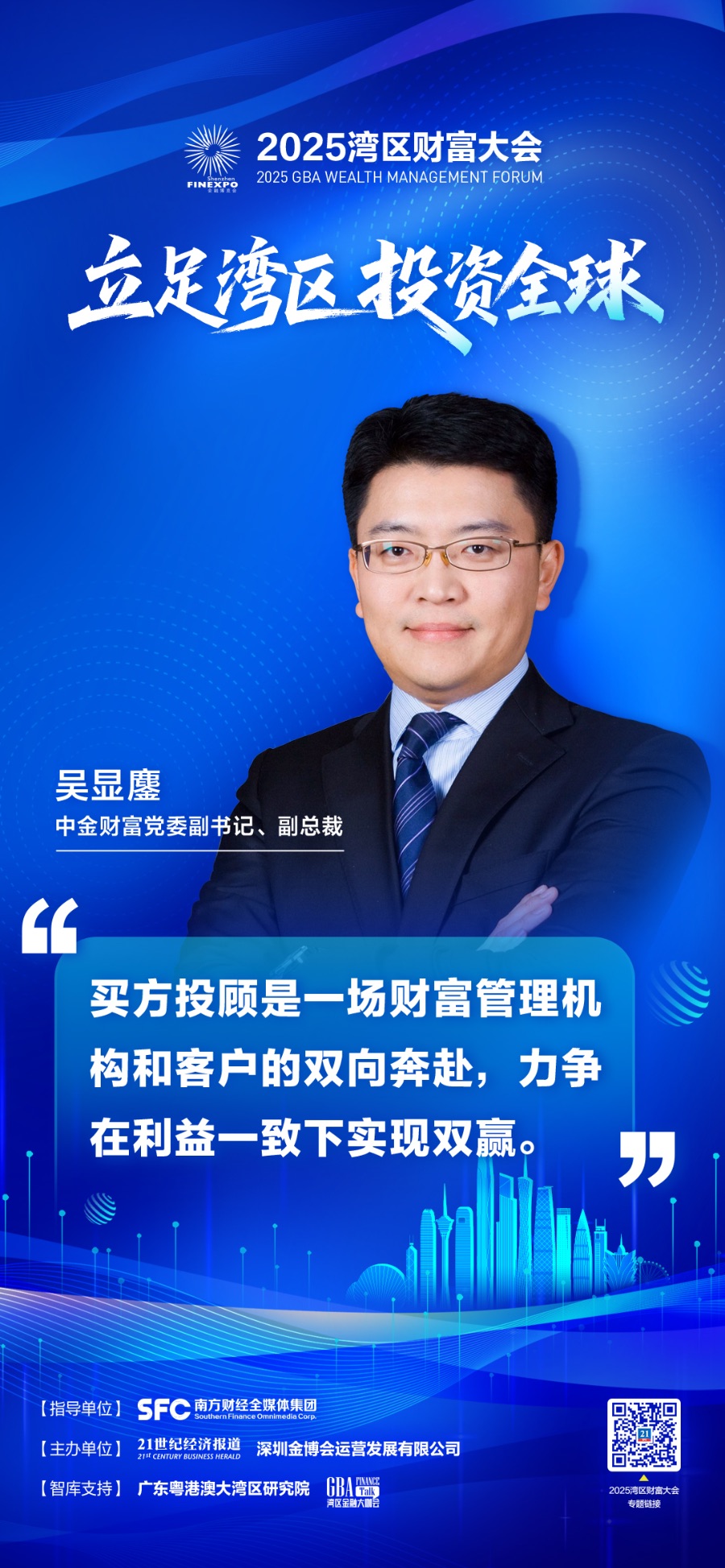 在上午举行的“立足湾区,投资全球”主题论坛上,中金财富证券党委副书记、执委会委员、副总裁吴显鏖围绕“财富管理行业趋势与实践”议题发表演讲。
