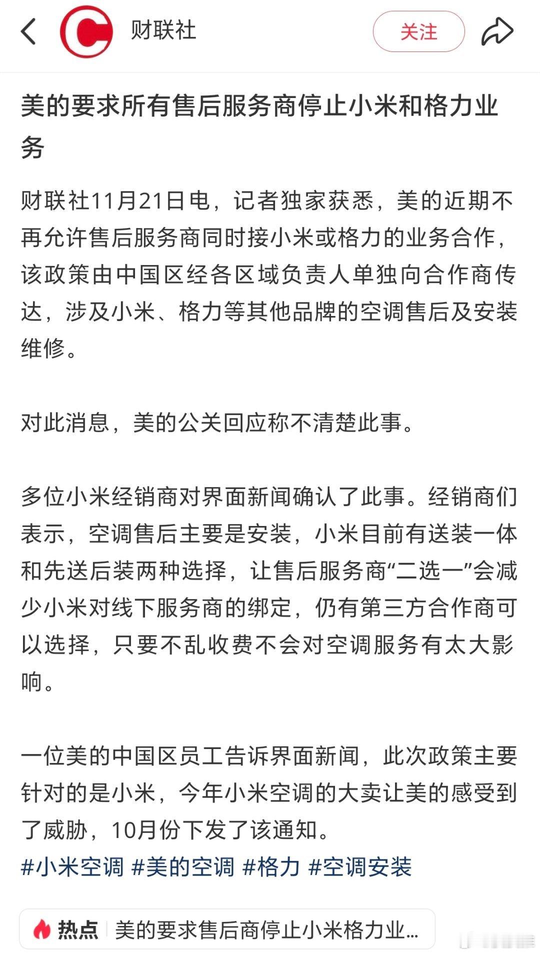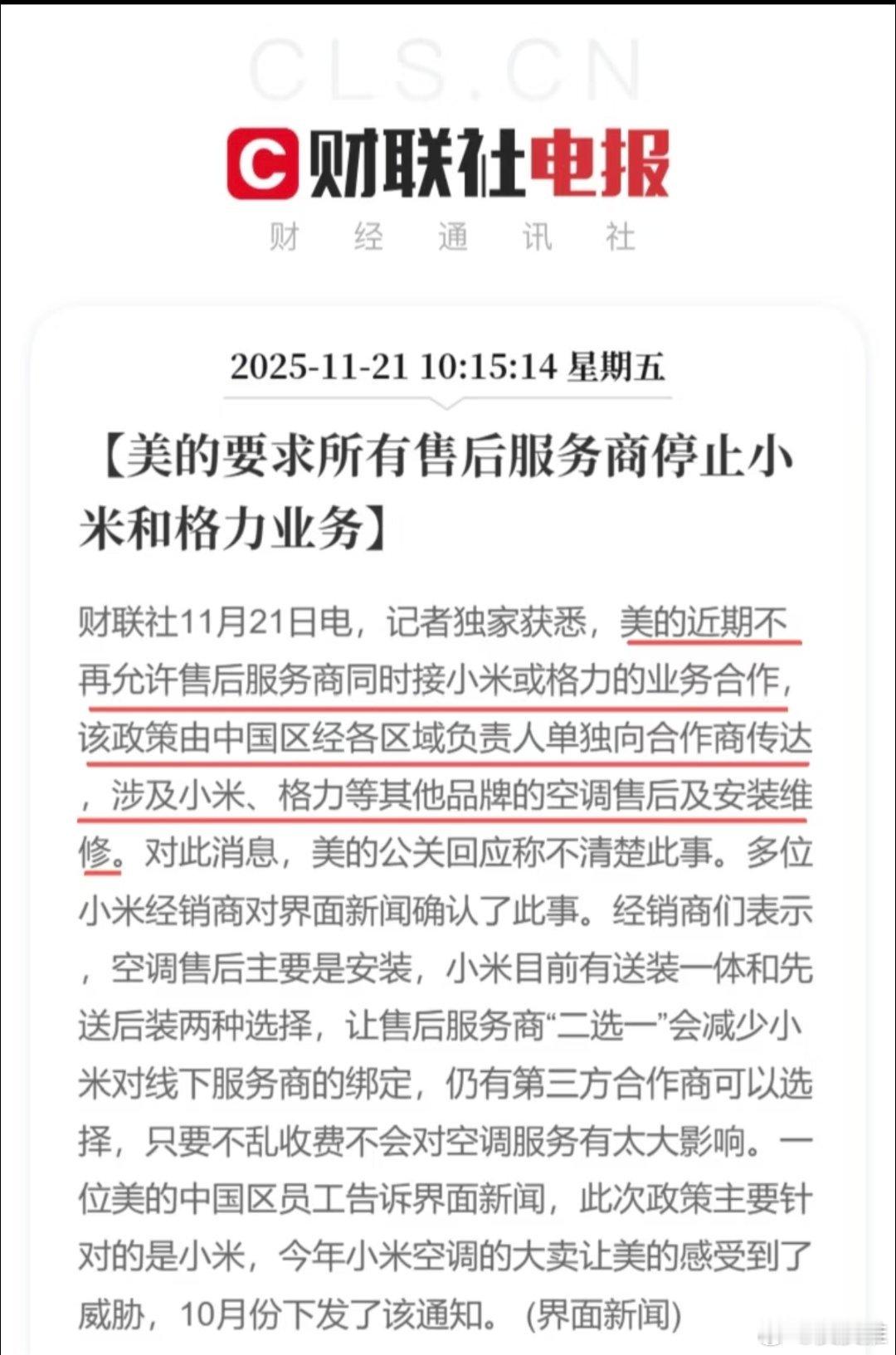 据财联社报道,今年小米空调的大卖,让美的感受到了威胁。近日,美的下发通知,决定不再允许售后服务商同时接小米或格力的业务合作,涉及小米、格力等其他品牌的空调售后及安装维修。大家怎么看呢?