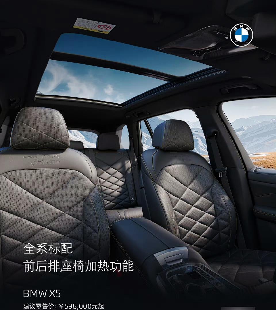 2026款宝马X5上市,标配M运动曜夜套装+智能驾驶辅助 售价:59.8万-74.8万 燃油 中大型SUV 车长5060,轴距3105 xDrive30Li 2.0T+48V轻混 xDrive40Li 3.0T+48V轻混 零百加速5.5秒(40Li车型) 标配M运动曜夜套装 定制黑色高光外装组件免费选装(40Li车型) 蓝色M高性能卡钳(40Li车型) 自适应双轴空气悬架(顶配) M运动型排气系统(顶配) 黑色22英寸铝合金轮圈免费选装(顶配) 黑色M高性能卡钳免费选装(顶配) 标配智能驾驶辅助系统Pro 智能互联驾驶座舱(含HUD) 水晶质感内饰组件 哈曼卡顿音响 前后排座椅加热 前排舒适型电调座椅带通风 定制Alcantara墨灰色车顶蓬(40Li车型) 碳纤维内饰+星空全景天窗(顶配) 朋友们觉得2026款宝马X5的升级有诚意嘛,来一起聊聊 BMW公路之王BMW X5