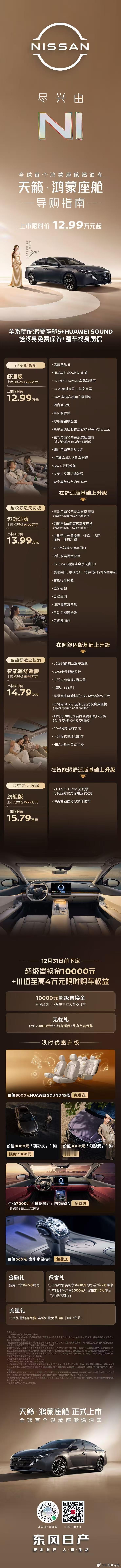 合资转型新范式的东风日产又又上新了今年的东风日产以合资企业最快的转型速度,为大厂们演示了转型的标准答案这次上新带来的是天籁·鸿蒙座舱,12.99万的起售价行业首次把鸿蒙座舱生态带到了12万区间已经和同价位的伙伴们已经形成了”同价不同智“的客观情况全系标配满血鸿蒙座舱5全系标配HUAWEI SOUND音响系统行业首创的终身整车质保和终身免费保养不仅配置看齐新势力,售后也要看齐新势力,价格更要看齐新势力希望各位媒体朋友们大力支持天籁·鸿蒙座舱上市,助力燃油车进入新势力时代,让行业进入智能化时代!