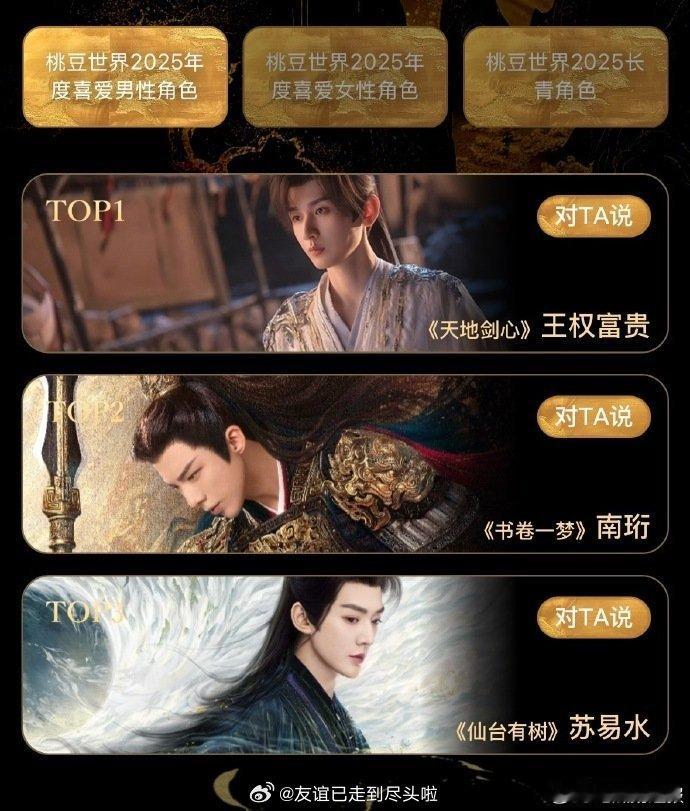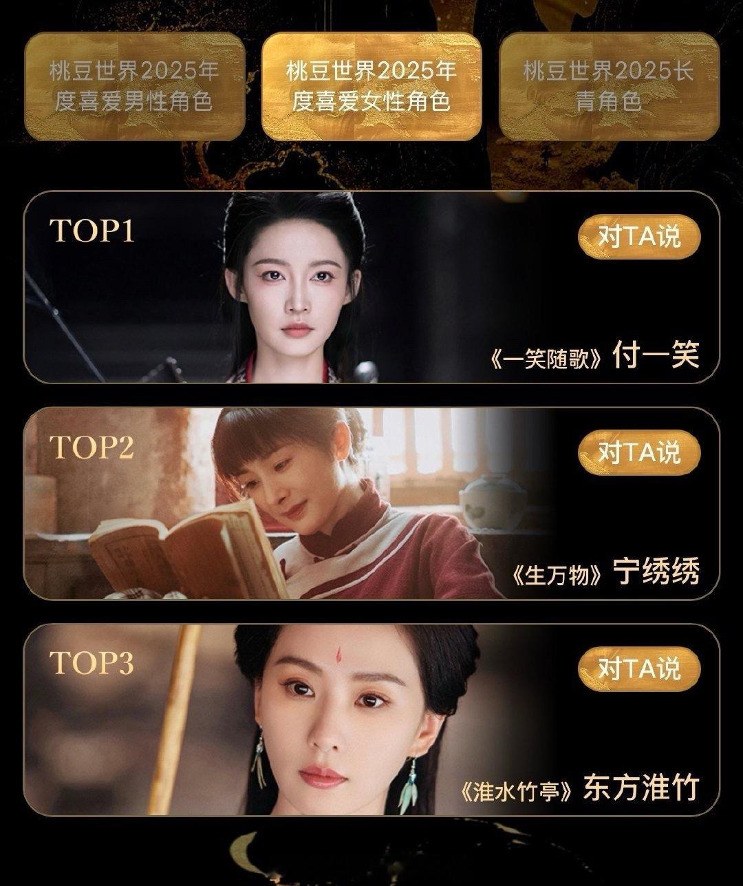 观众票选的桃豆世界:2025长青角色:成毅的李莲花、刘宇宁的宁远舟、虞书欣的小兰花2025年度喜爱男性角色:成毅的王权、刘宇宁的南珩、邓为的苏易水2025年度喜爱女性角色:李沁的付一笑、杨幂的宁绣绣、刘诗诗的淮竹