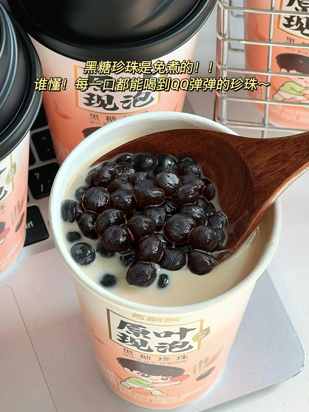 奶香奶香的巨丝滑~黑糖珍珠是免煮的,泡开后QQ弹弹的,每一口都能嚼到糯叽叽的珍珠