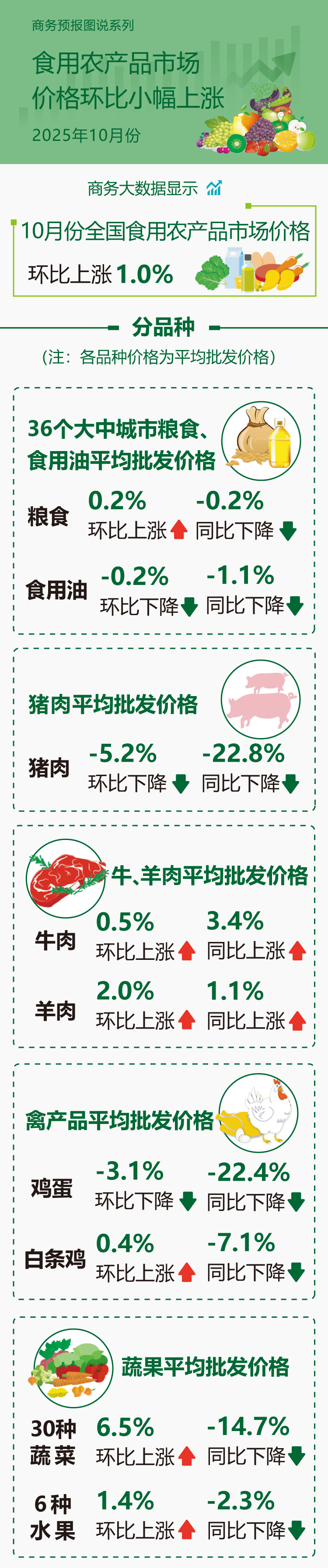 上证报中国证券网讯据商务部消息,商务大数据显示,10月份全国食用农产品市场价格环比上涨1.0%。
