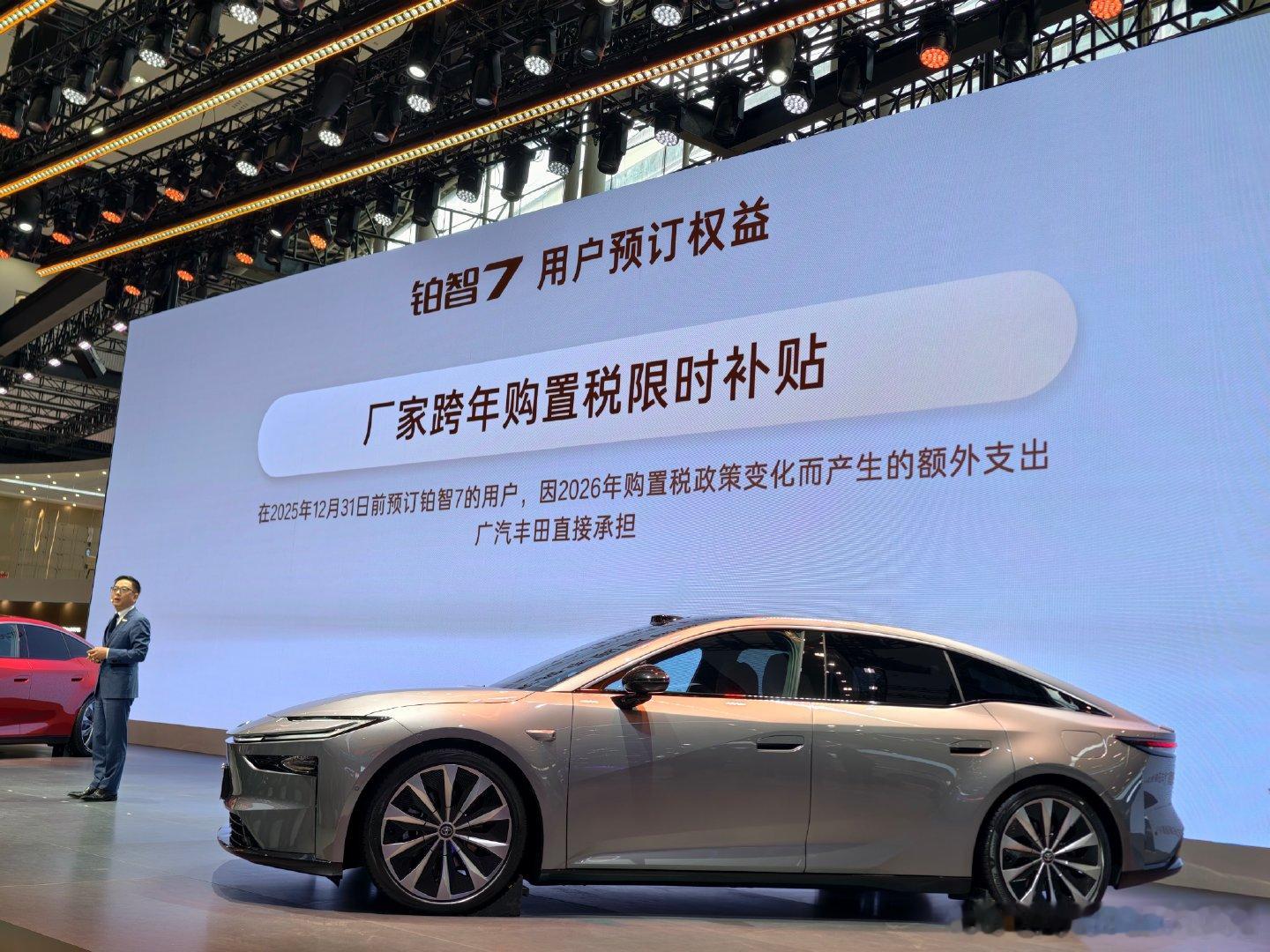 丰田鸿蒙座舱豪华旗舰D级纯电轿车铂智7,在广州车展正式亮相!新车是广汽丰田倾力打造的“合资新势力豪华旗舰第一车”。广汽丰田将这款豪华车型带入纯电家用轿车主流市场,目标是要成为“20万级纯电旗舰第一车”。铂智7的智能座舱完全满配,首搭鸿蒙座舱5.0,智能驾驶继续联手Momenta,软件搭载即将接入世界模型的Momenta R6飞轮大模型。安全方面传承铂智品牌“三双一冗余”设计,目前铂智7已同时且提前满足国家在电池安全、门把手等方面的严苛新国标。铂智7很豪华,它率先打破价值铁律,把20万级纯电家用轿车的价值感全面拉高,豪车才有的高价值配置一次给齐,双腔空悬,20万级少有。从全能实力到豪华体验,铂智7 彻底拔高20万级纯电家用轿车的行业标准。电车安全是头等大事,广汽丰田全力呼吁,希望更多的品牌加入到厂家直接担责行列,共同推动电车安全行业新标准!广汽丰田宣布,凡在12月31日前预订铂智7的用户,因2026年购置税政策变化而产生的额外支出,广汽丰田直接承担!您的全程相伴,广汽丰田全力保障!