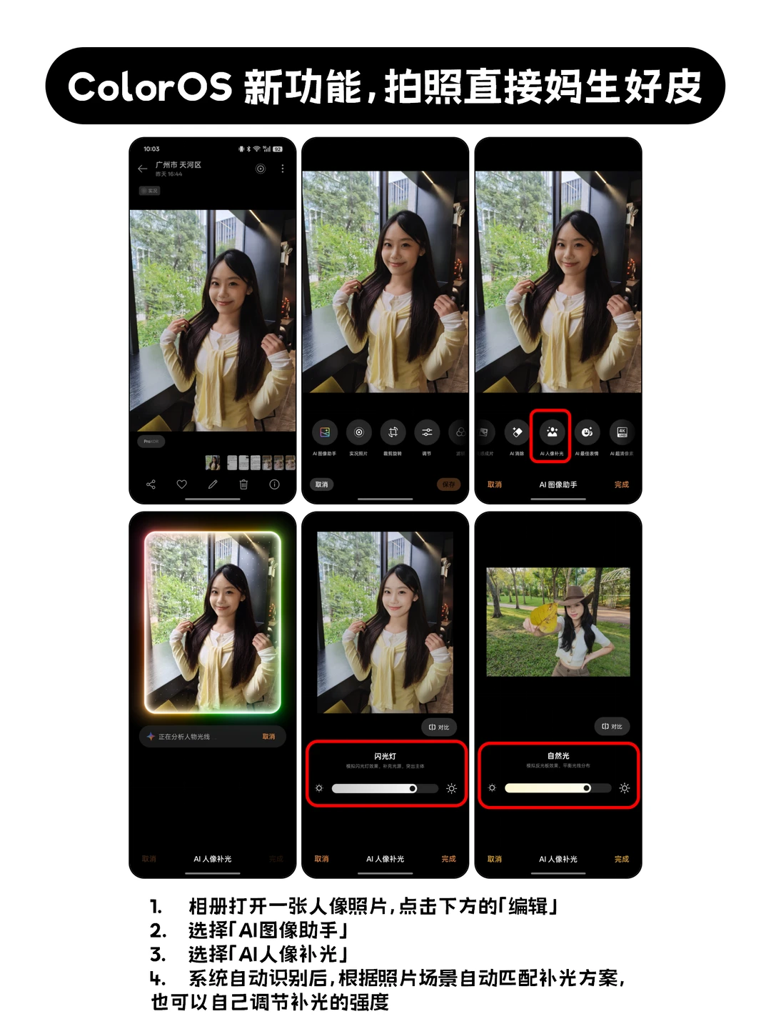 手机影像配置再厉害、模特再好看,如果环境没有好的光线,出图也是很难的,像是晚上和闺蜜聚餐、演唱会合影,照片要么脸黑成碳,要么闪光灯直打显油光,AI人像补光则能救回来[自拍R]