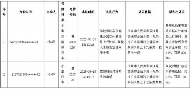 以下2名机动车驾驶人,因道路交通安全违法行为被东莞市公安局交通管理支队桥头大队电子监控设备记录,当事人未在法定期限内接受处理。根据《中华人民共和国行政处罚法》第四十四条、《公安机关办理行政案件程序规定》第一百六十八条等规定,现将其对应违法事实、理由和处罚依据公告告知如下,根据《中华人民共和国行政处罚法》第四十五条和六十三条的规定,当事人有提出陈述和申辩的权利。如要提出陈述和申辩的,请自公告之日起七日内向东莞市公安局交通管理支队桥头大队(东莞市桥头镇东深路石水口段896号,联系人:罗警官、杨警官,联系电话:0769-83563232)提出,逾期不提出的,视为放弃陈述和申辩。
