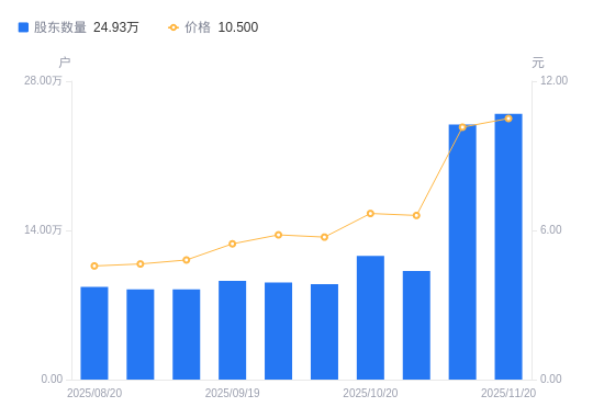 近一年(2024年11月20日至2025年11月20日),海马汽车A股股东户数从10.25万户,增加至24.93万户,增幅143.33%,区间股价上涨127.27%。