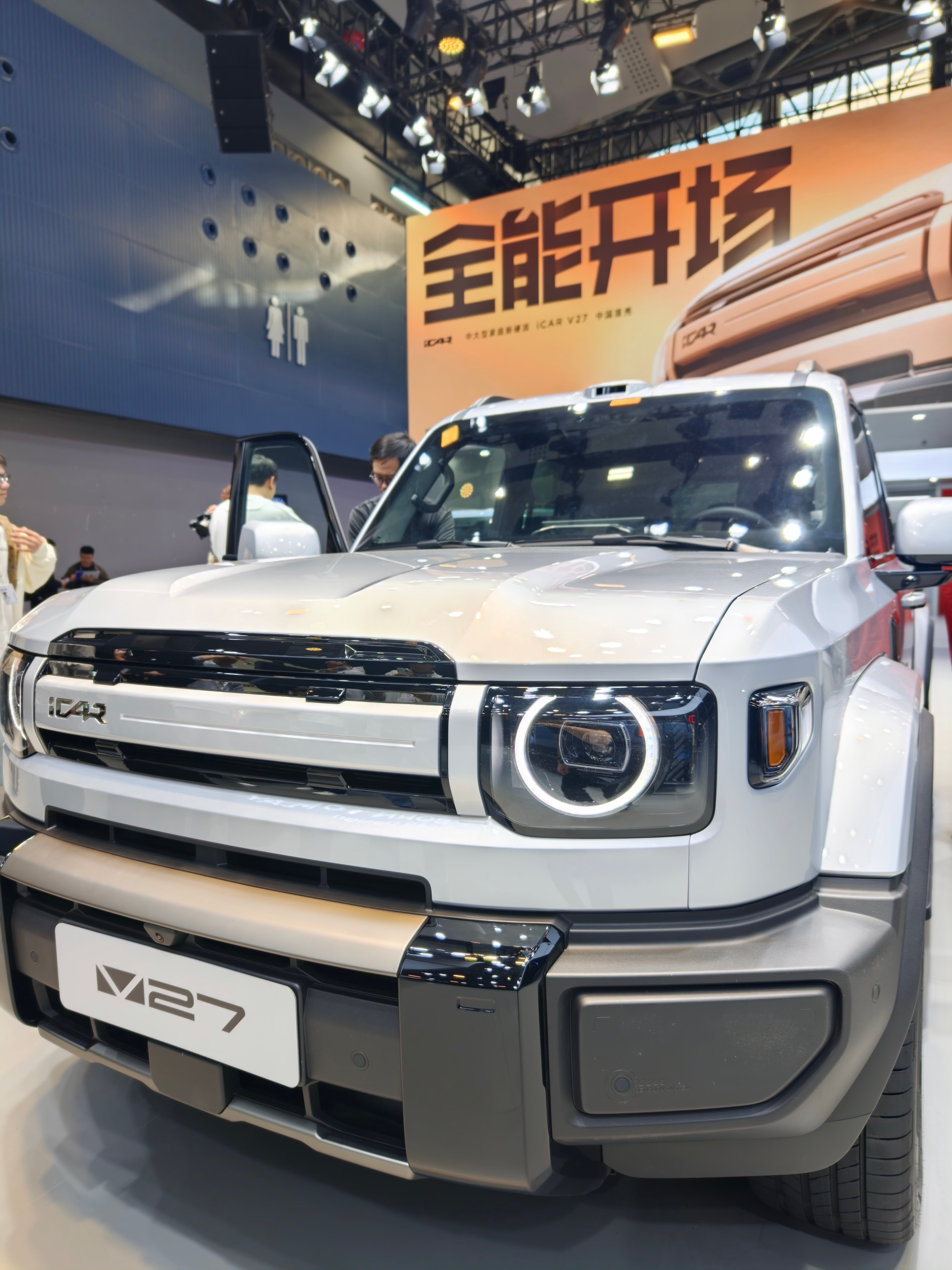 来广州车展看展,遇到了我喜欢的“两把刷子”,没想到吧,热爱打造大玩具的iCAR居然整了一台中大型家庭新硬派SUV,它不再是一个人的玩具,而是你和朋友、家庭出行的好搭子。外观方面,它采用未来经典设计理念,近1:1宽高比,四轮推向四角,短前后悬,直立的A柱,长轴距这些设计元素的加持,让V27姿态挺拔,气场非凡。动力方面采用行业最强黄金增程系统,发电机最高效率达95.38%,每升油能发电3.71度。综合续航达到1200 km+,纯电续航200km+,日常通勤用电更省钱,长途出行用油没有补能焦虑。同时,V27还有着超大空间,领先的69.9%超高得房率,1357mm车内净高让1.3m的儿童在后排轻松站立,也能给家人朋友更舒服的出行体验。星际舷窗双天幕能让你看到不一样的天空,天空岛顶棚除了提供氛围感外,拓展接口也为用车生活带来更多可能。值得一提的是,这么一款中大型SUV,还打造了超级猎鹰700智能辅助驾驶系统,车位到车位丝滑表现,让硬派方盒子也更智能。可以说,V27就是一款适合家庭出行的全能车,你想要的它几乎都有。、