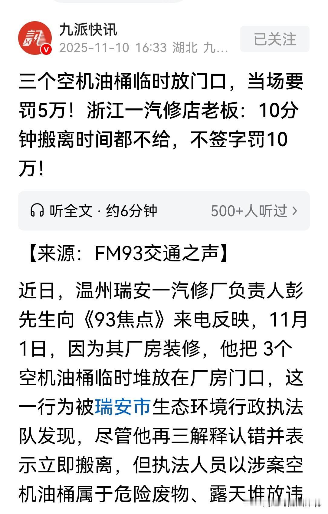 温州瑞安,一汽修厂正在装修,临时把3个空机油桶,堆放在门口,恰巧被生态环境执法队发现,当场罚款5万元。老板赶紧认错,马上搬离,但执法人员认定,空机油桶属于危废物品,任意堆放,必须“违法即罚”,并要求老板在罚单上签字。老板认为处罚太重,执法人员:今天签字罚5万,不签罚10万! 彭先生开了一家汽修厂,因行业不景气,生意一直勉强维持着。 事发那天,厂房内正在做地坪漆。 原本在厂房里放置的3个空机油桶,被员工临时挪到厂房门口。 计划做好了漆面就放回去,然而,事情就是这么巧! 生态环境执法队正好上门检查,一眼就发现了3个空机油桶,摆放的位置不对。 执法人员二话不说,立马就开了罚单,罚款5万元! 彭先生一下懵了,3个空油桶就罚5万,是不是处罚太重了? 他赶紧认错,并解释说,平时不放在这里,是屋内正在装修。 且这3个空机油桶是密封的,没有专业工具根本打不开,不会泄漏。 并马上让员工把控油桶搬离了。 彭先生怎么都没想到,机油桶刚放了几分钟就被查,还要罚款5万。 彭先生说,机油桶是空的,没有残渣,也没有造成环境污染。 并非长期或者故意把空机油桶放在门口,只是在屋内地面施工时,临时放一会。 如果10分钟之内处理不完,你们再处罚我。 彭先生的意思是立马整改,求执法队给他们个机会。 毕竟现在生意难做,罚款5万,相当于他们一年的利润了。 而执法队员都是包公出身,面对执法,他们铁面无私! 工作人员严肃的说:你们的问题,属于随意摆放危险废物。 而且露天堆放,违反了相关规定,“违法即罚”,并要求彭先生在罚单上签字。 彭先生说,字肯定不能随便签,一旦签字,就是板上钉钉了。 执法人员指着罚单说:你不签,数罪并罚,罚款10万,你签了字,就只罚你5万! 事后,彭先生越想越觉得自己被罚太冤了,整改的机会都不给! 首先,自己并不是故意堆放,而且现场整改了。 可人家根本不给整改的机会,直接就开罚单。 罚款5万的处罚,对汽修厂来说负担太重。 无奈之下,彭先生求助媒体,希望能得到公平、公正的处理。 彭先生表示,今年的行情不好,利润微薄到把相关费用降到了最低。 也只能维持员工的工资,和汽修厂的基本运转,尽管这样,也只能勉强维持。 每月的利润只有几千,有时候几千都不到,难以承担这么重的处罚。 为了弄清事实,记者和彭先生来到执法队。 工作人员表示,对彭先生的处罚有法可依。 工作人员拿出文件,根据相关规定:沾染了废机油的空机油桶,属于危废,必须规范存储。 而且不管桶内有没有残留,都要按规定放置。 如果有残留油渣,查到既是违法,处罚更严厉,可处罚10万元以上,100万元以下。 也就是说,最低处罚都得是10万起步。 彭先生承认,自己因疏忽把空机油桶放置门口。 但他确定自己没有恶意违法,是否先教育整改,如果拒不整改,再罚款。 而工作人员坚持,“违法即罚”原则,不会妥协! 记者问工作人员:对签字罚5万,不签罚10万,有这样的法条吗? 工作人员说,彭先生触犯了环境法律,本身处罚就很重。 当时按条文最低罚款5万,如果情节严重的,不配合工作的,当时就是10万以上的罚款。 执法队根据条文,在彭先生及时整改,没造成污染的情况下,对其减轻至法定最低罚款数额的50%。 已经给他减免了一半的罚款数额。 对此,有专业人士人认为,这属于典型的机械式执法。 根据法律规定,如果是初次违法,危害轻微,并及时改正。 或者临时堆放危废,又愿意及时整改,没有造成实际后果的,可不予行政处罚。 总之,像彭先生这种情况,执法队可罚可不罚。 负责人表示,法律允许的时间是3个月,期间可能还要叫彭先生过来补充谈话。 根据《固体废物污染环境防治法》第79条规定:产生危险废物的单位,应当按照有关规定和环境保护标准要求贮存、利用、处置危险废物,不得擅自倾倒、堆放。 这条法律规定,为了确保危险废物,得到妥善处理,防止对环境造成危害。 本案中,汽修厂的空机油桶因为沾染过废机油,属于危险废物。 按照规定,是不能随意放在厂房门口的。 即使是临时放置,也违反规定,有污染环境的潜在风险。 《行政处罚法》第32条规定:当事人主动消除或者减轻违法行为危害后果的,应当从轻或者减轻行政处罚。 汽修厂老板,在执法人员发现问题后,马上认识到错误,并让员工将空机油桶搬离。 属于主动进行了整改,消除了可能产生的危害后果。 《行政处罚法》第5条规定了过罚相当原则,应充分考虑违法行为的事实、情节及其危害程度。 根据上述法律条款,彭先生这种情况,应该从轻或者减轻处罚的,甚至在结合“首违不罚”等相关原则情况下,存在不进行处罚的可能。 目前,案件仍在调查中,工作人员表示,罚款金额尚未最终确定。 对此你怎么看? 冬日生活打卡季 关注@赵哥的法律观