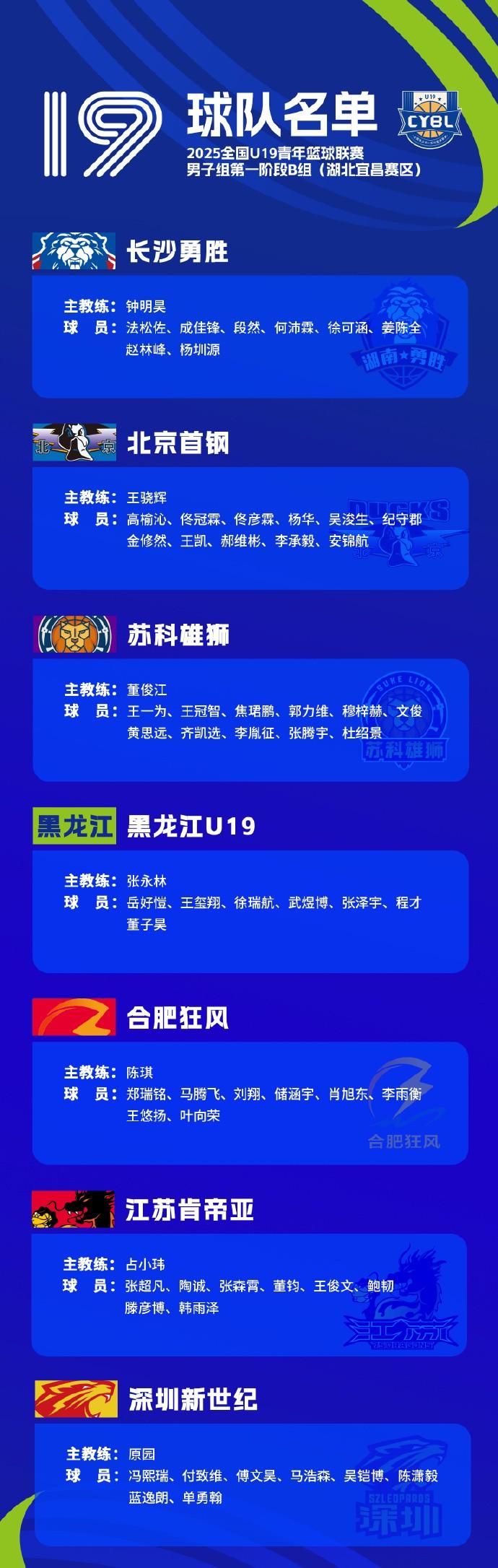 B组-湖北宜昌赛区:长沙勇胜、北京首钢、苏科雄狮、黑龙江U19、合肥狂风、江苏肯帝亚、深圳新世纪。