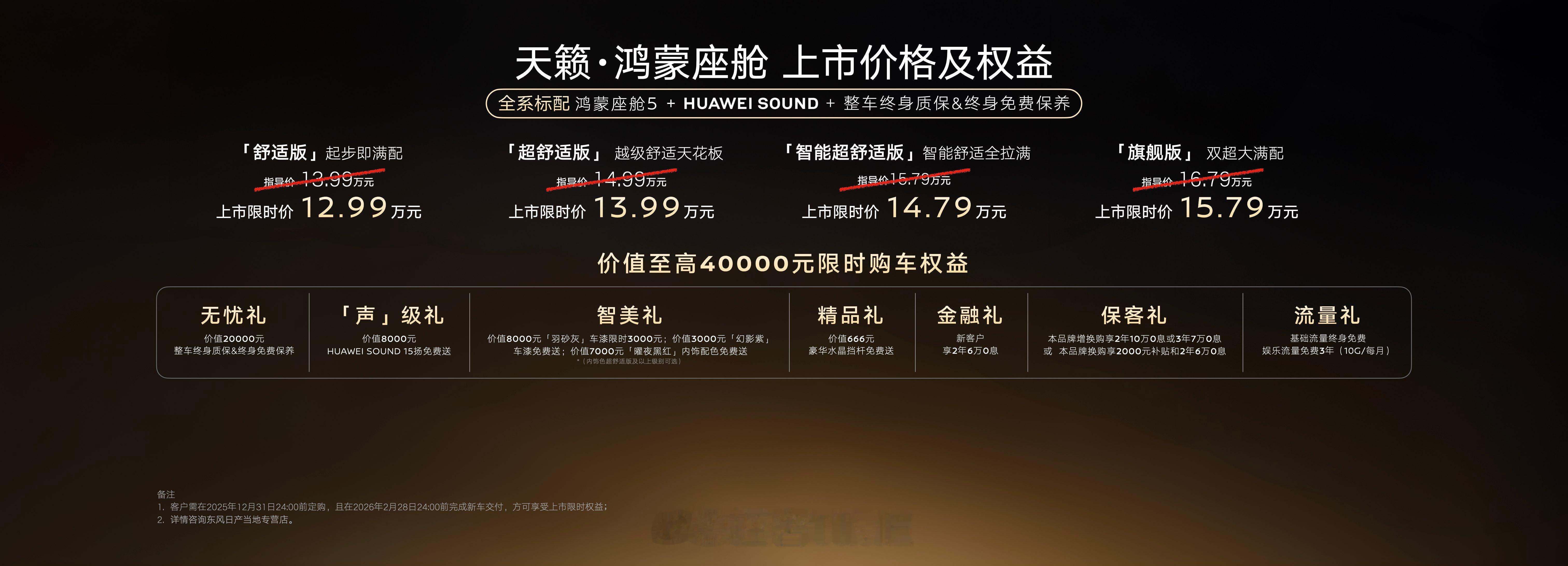 东风日产天籁·鸿蒙座舱上市,定义"燃油智能第一车"。11月21日,东风日产天籁·鸿蒙座舱在广州车展正式上市。新车全系标配鸿蒙座舱5及HUAWEI SOUND音响系统,推出4款配置,限时诚意价12.99万元起。作为全球首款鸿蒙座舱燃油车,天籁以五大产品亮点重塑燃油车智能标杆:搭载2米贯穿式LED大灯、SPA级座椅按摩、15.6英寸智慧屏、17扬声器音响系统和2.0T超变擎发动机,实现智能体验的跨越式升级。东风日产以"油电同智"战略推动科技平权,为超3亿燃油车用户带来实用好用的智能出行新选择。