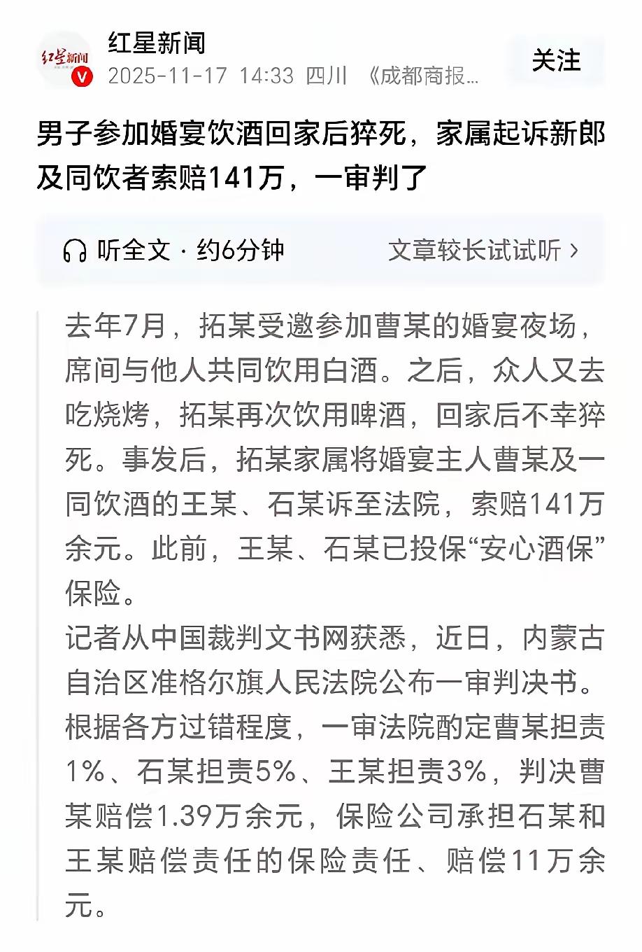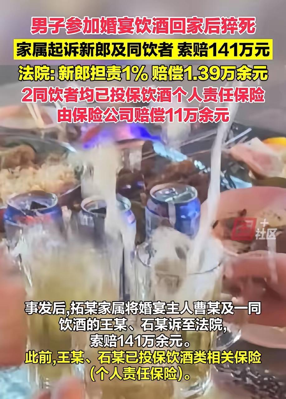 内蒙古,男子参加婚宴期间,喝了几杯白酒。婚宴结束后,他还不尽兴,又联系朋友去吃烧烤,还喝了少量的啤酒。谁能料到,男子回家后,当晚发生心源性猝死。男子家属悲痛之余,把新郎官以及一起喝酒的朋友告上法庭,索赔141万。新郎:正常办个婚宴,怎么还摊上了官司?一起喝酒的朋友更是委屈,他们没有强行敬酒和劝酒,男子喝酒并不多,回家的时候好好的,猝死了凭什么要他们赔偿?法院审理后,作出的判决让他们彻底傻眼。 ​去年7月,男子拓某高高兴兴去参加朋友曹某的婚宴,万万没想到,这一去竟成了永别。 在这个平凡的夏日里,拓某的故事像一面镜子,折射出我们身边那些看似微不足道,却又深刻反映人性与社会现象的细节。一个普通男子,无意中成为了一场法律纷争的焦点,也让我们不得不思考:什么才是真正的责任?又如何在欢聚的背后守住那份理性与底线? 拓某的悲剧,似乎是一场意外,但更像是一面镜子,映照出我们每个人心中的那份“喝酒文化”。在中国,酒桌文化根深蒂固:敬酒、劝酒、畅饮,似乎成了社交的必备“调味料”。然而,谁又能想到,一场原本应是庆祝的婚宴,会演变成一场法律的“审判”?拓某的猝死,不仅让家属陷入无尽悲痛,也引发了公众对于责任认定的广泛讨论。 法院的判决,让人既震惊又深思。为什么喝酒的朋友要承担如此沉重的赔偿责任?他们没有强行劝酒,没有逼迫拓某喝酒,甚至在事发前一切都还平安无事。难道喝酒本身就变成了一种“危险”的罪名?还是说,现代社会对“责任”的界定已经变得模糊?这个判决无疑给所有人敲响了警钟:我们在享受社交与欢愉的同时,是否也在无形中埋下了法律的地雷? 更值得深究的是,拓某的家属为何要将新郎和朋友告上法庭?他们的悲伤、愤怒甚至无助,是否也在无形中被社会的“责任追究”所放大?这场官司,究竟是在追求正义,还是变成了一场情感的发泄?从某种角度看,这既是一场关于责任的争夺,也是一场关于现代社会价值观的碰撞。 这件事告诉我们:在欢聚之时,责任与界限同样重要。我们不能否认,酒桌上有人“劝酒”带来的压力,也不能忽视,法律对于责任的界定需要理性与人性兼顾。作为普通人,我们要学会在享受生活的同时,懂得保护自己,也要明白,责任不是简单的“吃瓜”态度,而是每个人心中的那份底线。 或许,这场悲剧本身是一场提醒:在追求快乐的同时,更要懂得理性与责任。我们不能让一时的欢笑,变成永恒的遗憾。希望每一个在喜庆场合的人,都能在笑声中多一份理智,在欢聚中多一份责任。毕竟,生命只有一次,守住那份底线,才是真正的幸福之道。公司聚会饮酒后,死亡,算工伤吗? 人这一生有哪些东西真正属于自己