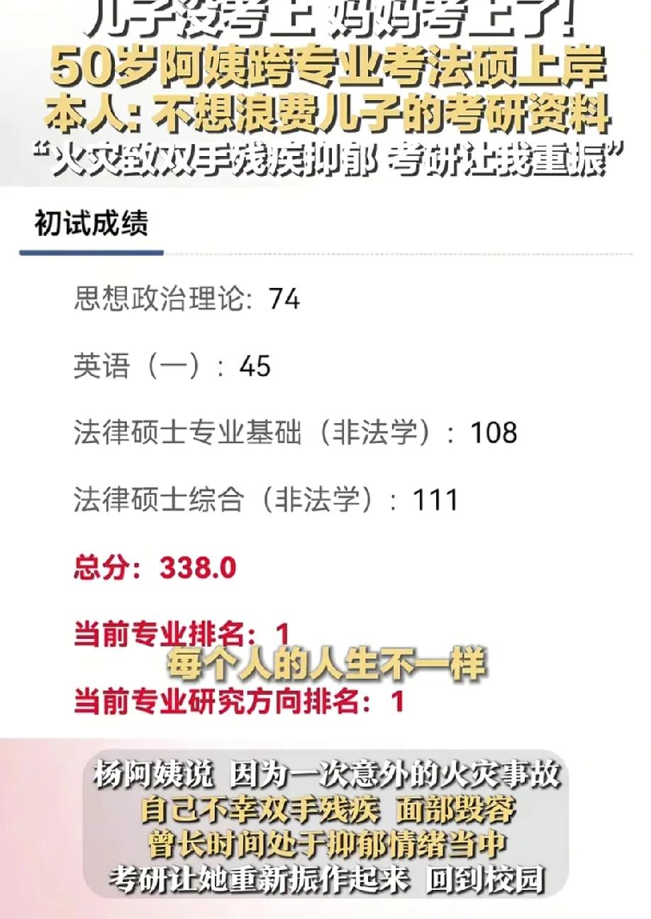 这下儿子该郁闷了[笑哭] 近日一位济宁的阿姨,在社交平台上发布自己考研的经历,真的太让人佩服了。 这位阿姨年纪都50岁了,他看到儿子没有考上研究生,家里剩那么多书,一点都没有动,然后看看书里的题目觉得不难。 于是这位阿姨放弃了跳广场舞的时间,放弃了,各种娱乐时间在家里疯狂学习。 果然老天还是关照努力的人的,这位50岁的阿姨被西北一所大学录取,而且还是被法律专业录取。 不得不说这位阿姨真的太厉害了,都50多岁了,还能保持如此旺盛的精力。不过补充一点,这位阿姨本科是同济大学的,所以她能考上也是有一定道理的。毕竟人家的底子就在那里呀[捂脸] 这就不得不让我想起我那位老师了,她是教师,但是呢学校只跟他签合同,没有给他编制,周围的小辈都在明里暗里的嘲讽他没有编制。 我这位老师都40多岁了,还领着一个10多岁的孩子,就在这样的条件下,他天天4点多起床,早晨起来背心理学,中午刷题,就这样熬了好几个月,最后考编制一举上岸。 所以说只要努力,该是你的一定能得到。没有得到,那就说明努力还是不够,没有人一生下来就是天才,天才也是需要努力的。 为这位不服输的阿姨点赞![赞][赞][赞]