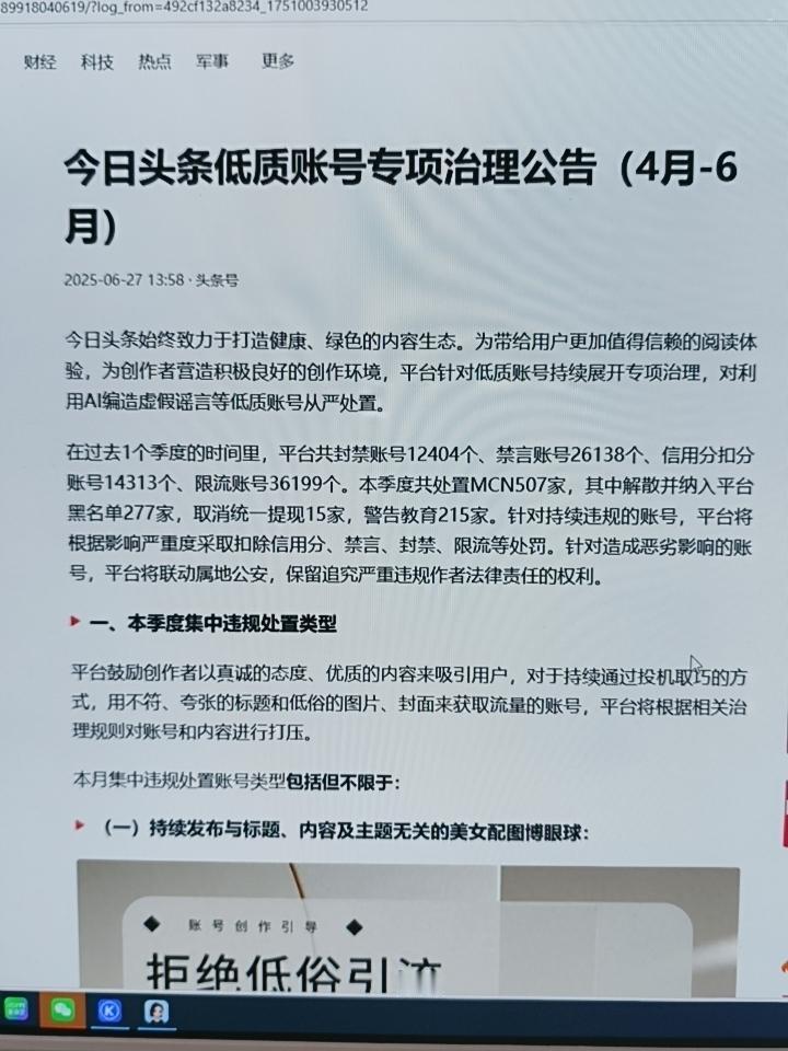 给那些还在头条赚取收益的一些朋友一些忠告!我告诉大家来头条一定不要先着急发这样那样的一些文章,首先要说多和了解头条的规则,我用一个账号在头条发文章时,不小心借用了一下别的配图,结果被判定为劣质账号扣除信用分不说,还禁言七天!后来我上诉了,感觉还是不怎么管用,后来阅读这些规则才发现,其实现在的头条真正的事苍文章到世界叙事和配图都不需要原创,但是不知道原创的流量高不高,但是头条现在相比以前要规范的多,严格的多!