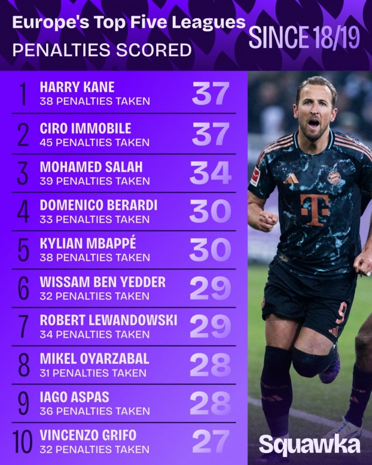 直播吧11月21日讯Squawka统计了2018-2019赛季以来球员在五大联赛的点球进球数量,并列出榜单,凯恩、因莫比莱37球居首,萨拉赫34球第三。
