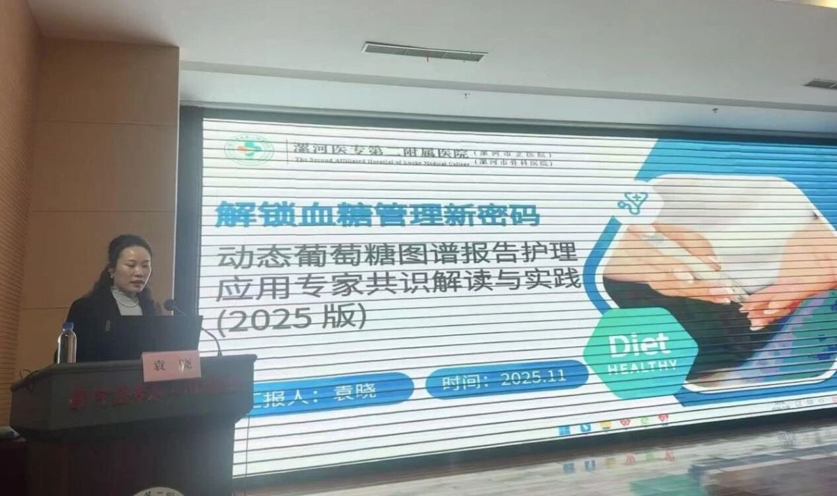 漯河市第一届糖尿病护理专业委员会委员、漯河医专二附院糖尿病护理学组副组长袁晓,讲解了《动态葡萄糖图谱报告护理应用专家共识》,阐述了如何解读动态葡萄糖监测报告并指导临床护理实践、优化血糖管理策略,标志着糖尿病护理向数据化、精准化迈出了坚实一步。