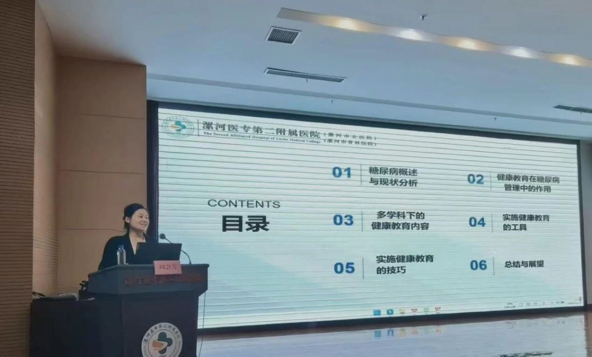 漯河医专二附院内分泌科主管护师、河南省健康科普讲解大赛金奖获得者周会芳,以《多学科视角下糖尿病患者健康管理实践》为题,分享了在多学科协作模式下如何整合资源,为糖尿病患者提供全方位、立体化健康管理服务,以及如何利用AI技术制作健康宣教视频,展现了创新健康管理模式的实践成果。