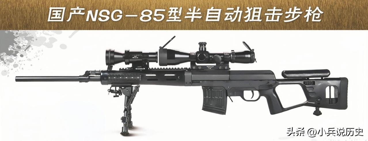国产NSG-85型半自动狙击步枪 北方公司以我国85式7.62毫米狙击步枪为基础,做了款NSG-85型半自动高精度狙击步枪。 改的地方都很清楚:枪身怎么摆重新设计,上部装了一根长的皮卡汀尼导轨;护手换成能在侧面加导轨的聚合物材料;枪管是浮置着的,贴腮的板子能调高低,枪托下面有个能调高低的单脚架。 它用的是CS/BFL7型7.62×54毫米狙击弹,还有白光瞄准镜、微光或红外夜视镜、光电观察仪,800米以内的活人目标都能精准打中。