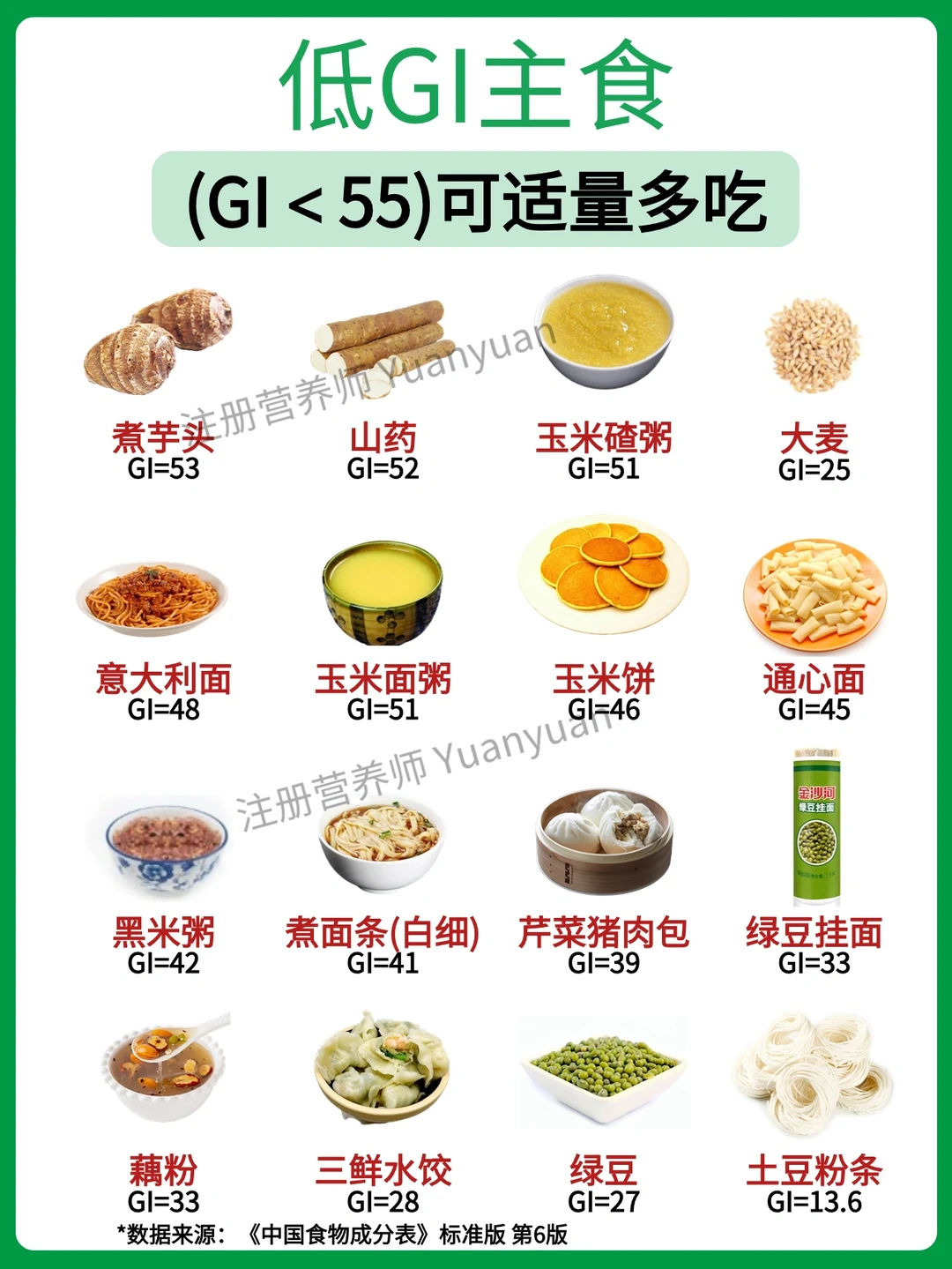 📌低GI 的主食(GI<55)可以放心吃,胃肠道中停留时间最长、吸收率最低、血糖升高的速度最慢。