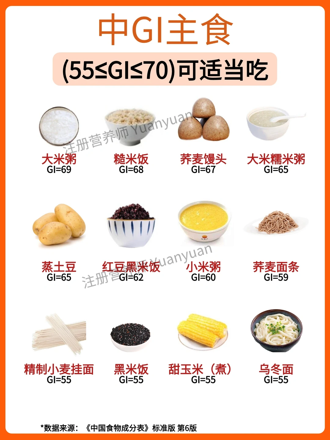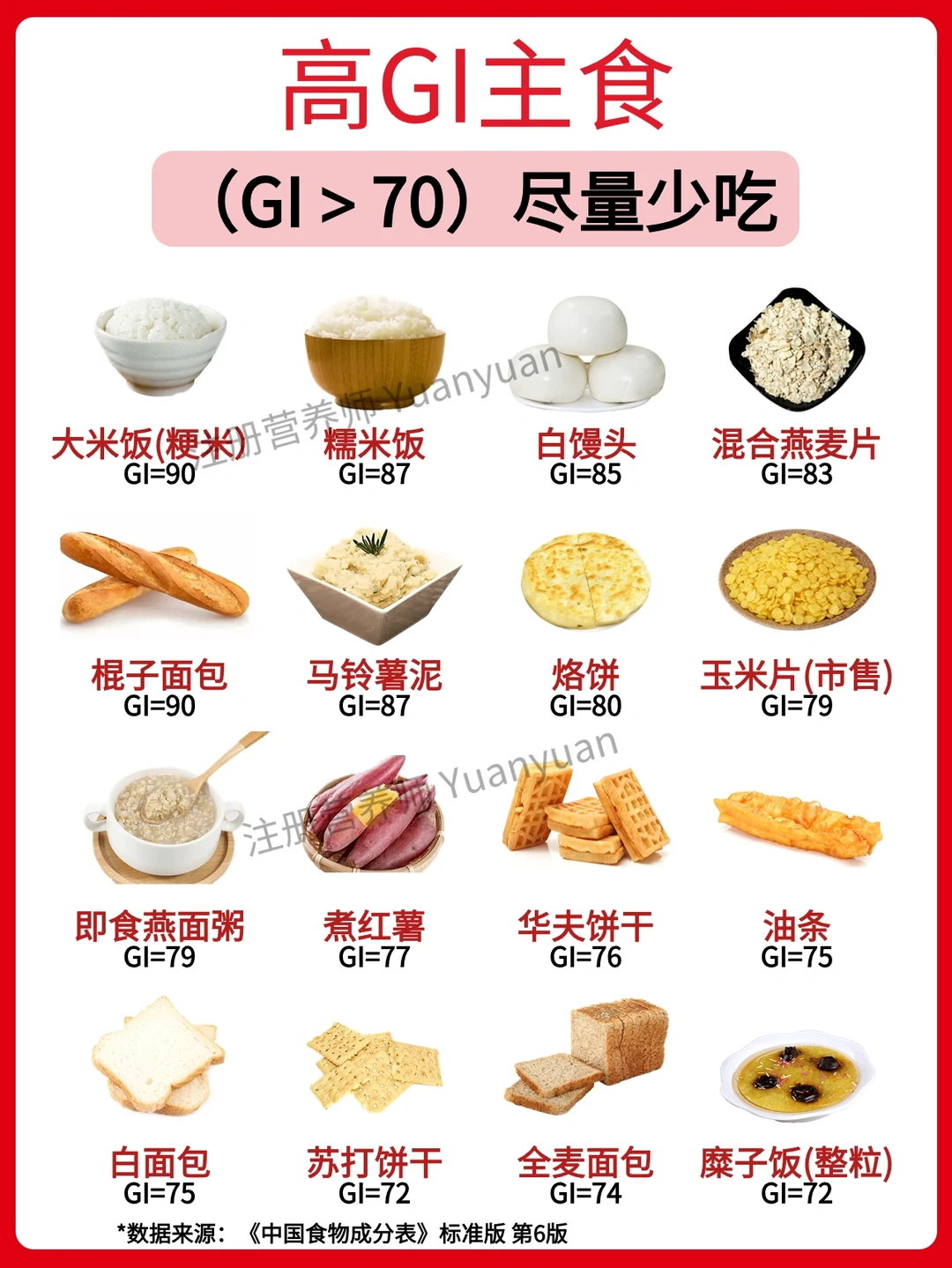 📌高GI的主食(GI>70)尽量少吃,进入肠胃后消化快、吸收率高、血糖升高的速度快。