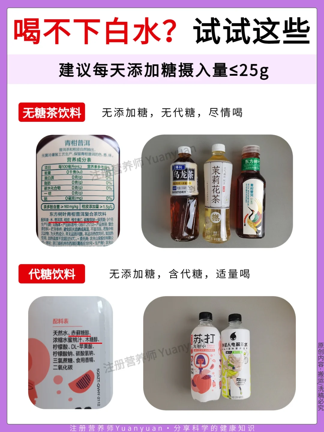 👉比如无糖茶饮料(无蔗糖、无代糖),代糖饮料(这个要适量喝,因为代糖安全性也有争议)