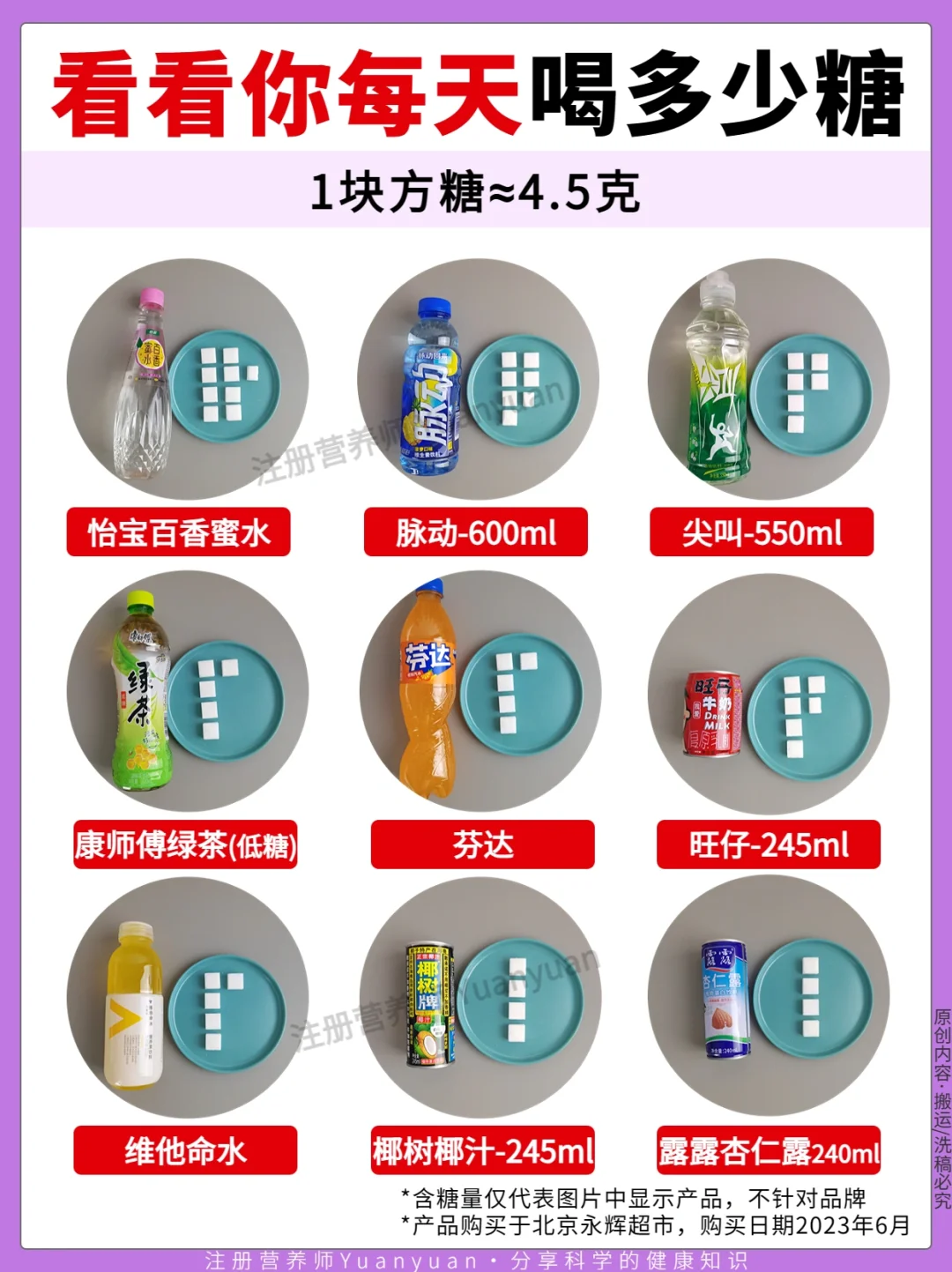✌扒了18款常见饮料的含糖量(一块方糖重量大概是4.5g),看看你平时喝了多少糖。