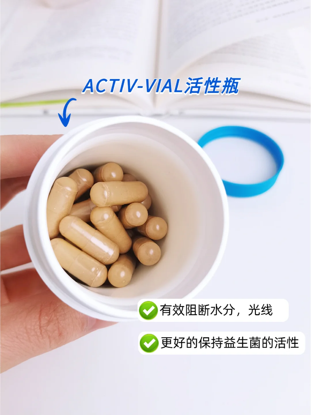 🔅而且,这款益生菌的瓶子设计也很nice💕,用了ACTIV-VIAL活性瓶设计,这种瓶相当于一个防潮箱,可以隔开水分和光线,即使开封了也能做到防潮锁鲜,能更好的保持益生菌的活性👏。