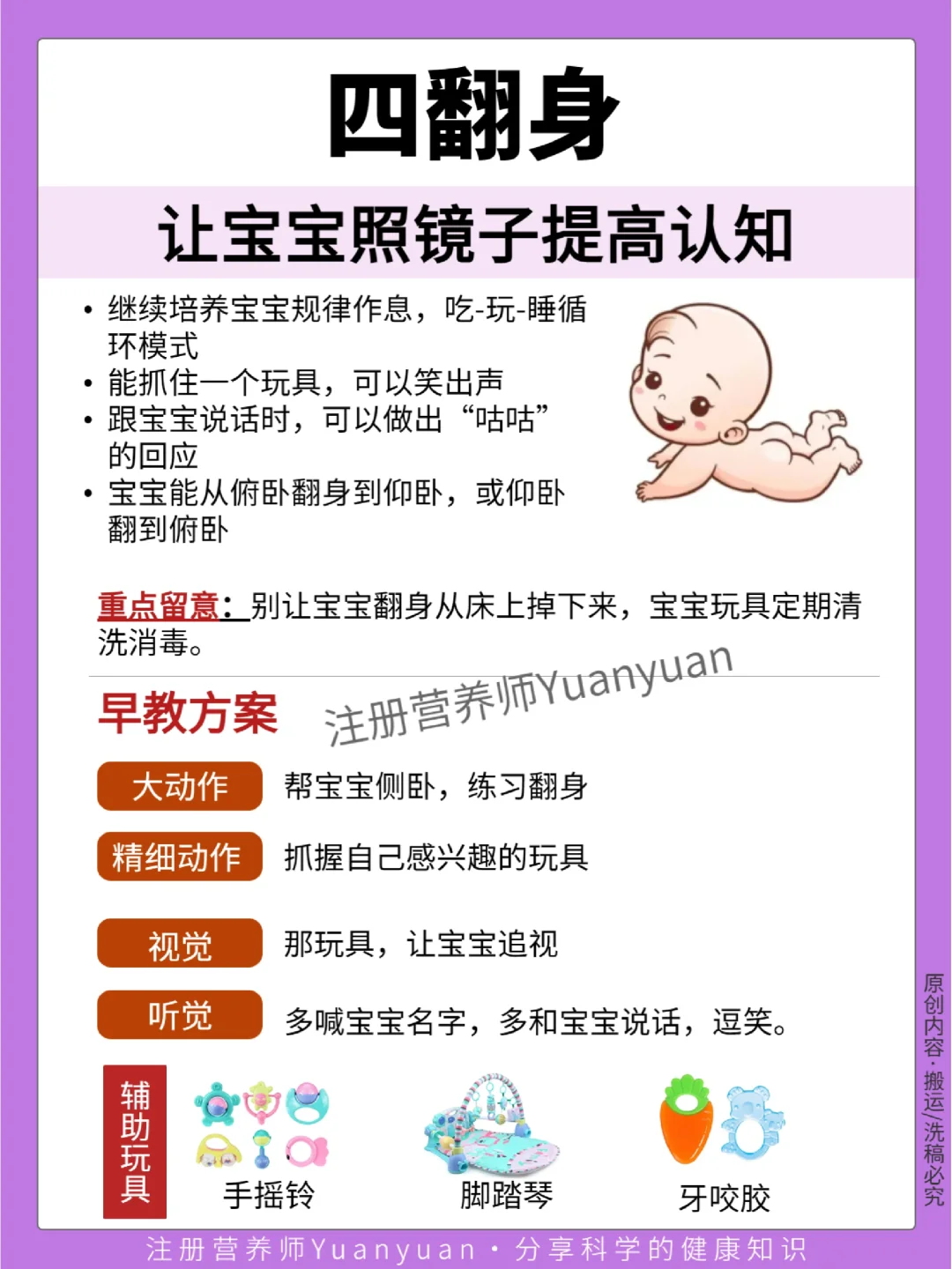 四个月的宝宝要练习翻身,有些宝宝这么大已经会翻身了,他的四肢变得有力,睡眠时间减少,父母要注意别让宝宝在边缘处活动,容易摔。也有少数宝宝出牙了。