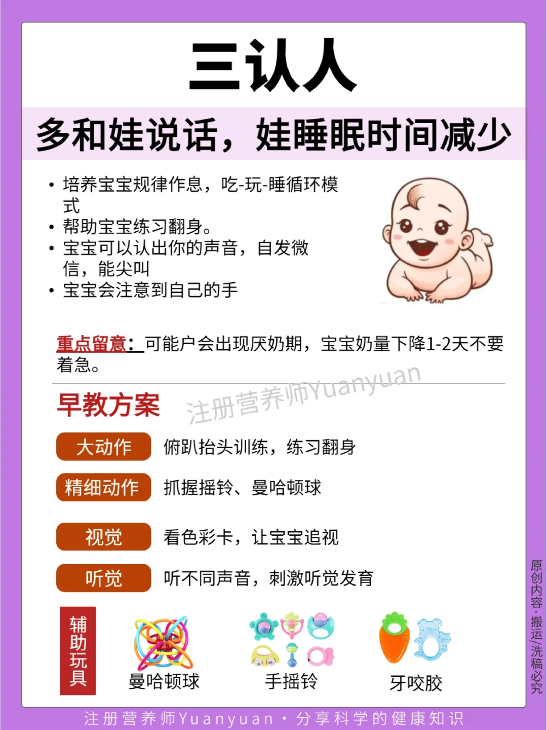 三个月的宝宝可以抬头,认识妈妈,看彩色卡!但是睡觉时间减少了,父母尽量不抱睡,宝宝的视力越发清晰,注意避免强光玩具哦~
