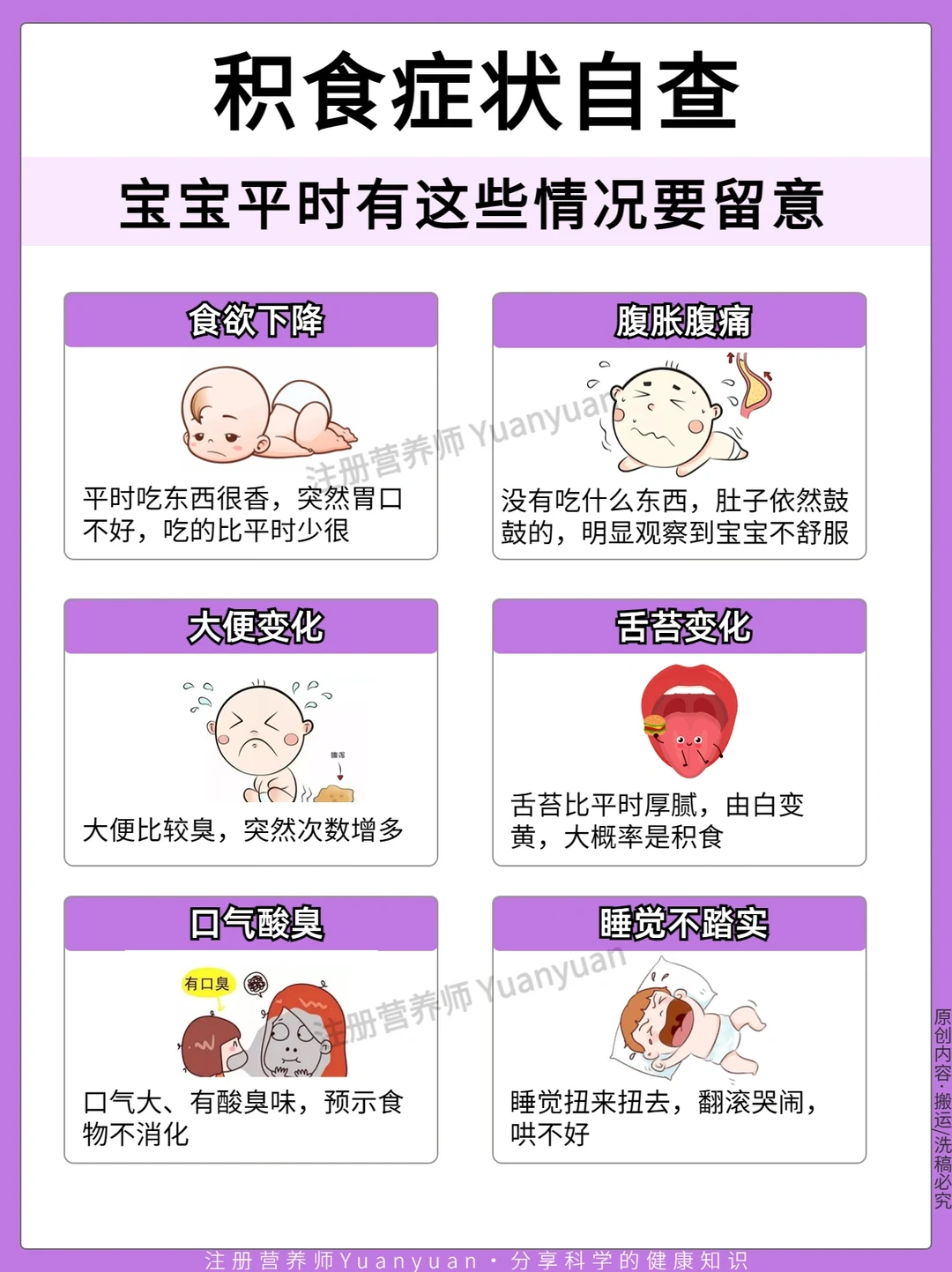 ✅经常积食:表现为食欲差、腹胀、腹痛、呕吐、腹泻/大便稀溏(粘腻不成形)、便秘/大便酸臭、有口气、夜间哭闹、舌苔白腻/厚黄