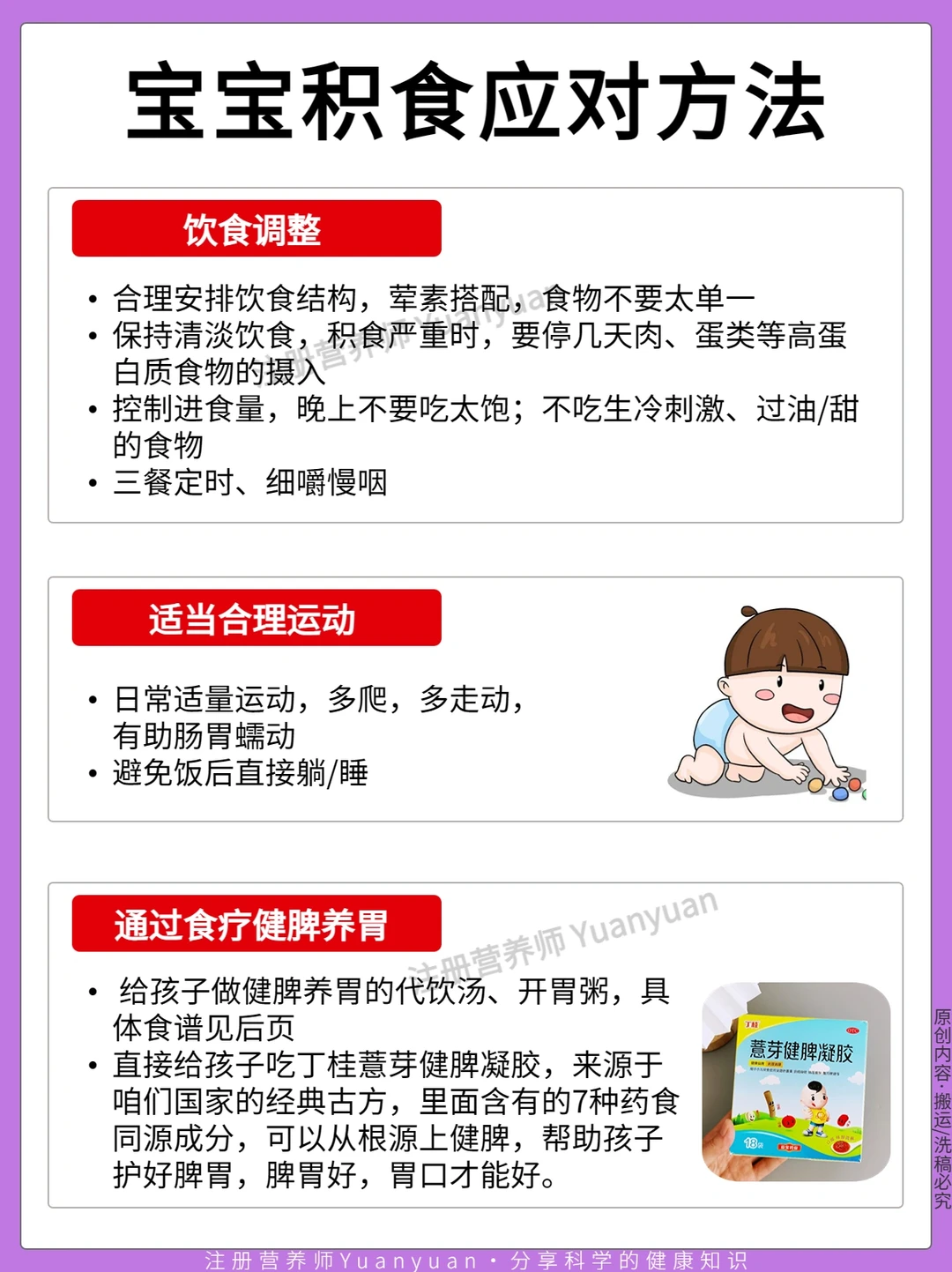 ✅让宝宝多餐少食,选择清淡易消化的食物,还要多多运动!