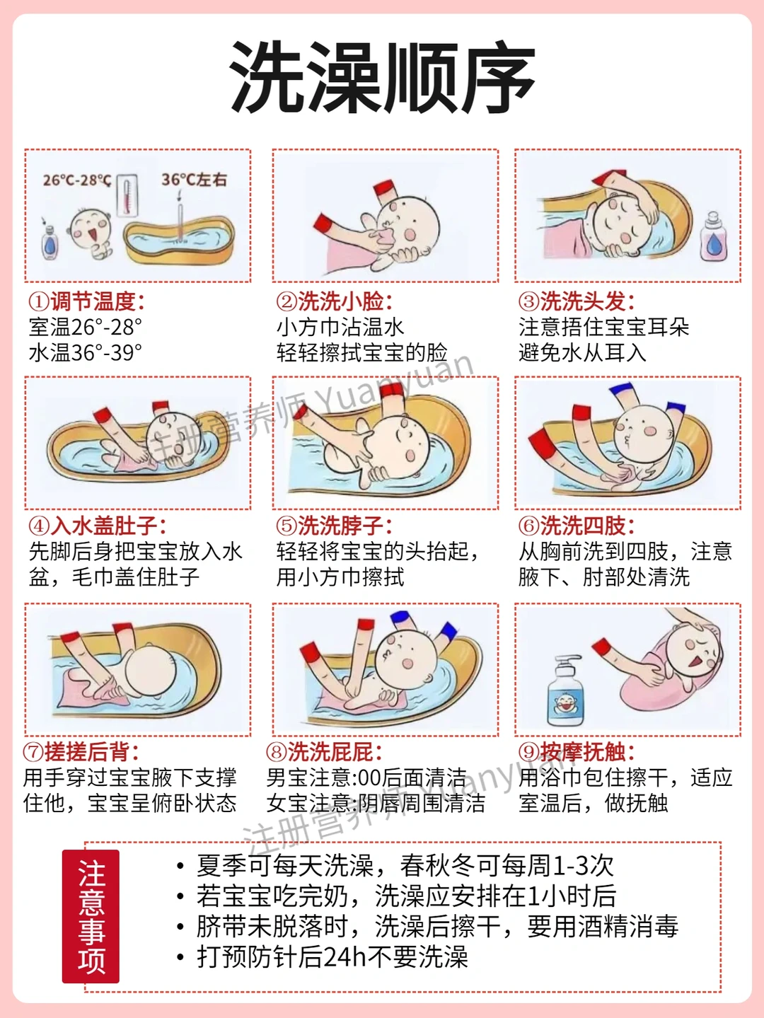 ⚠️需要注意:若宝宝吃完奶,洗澡应安排在1小时后;脐带未脱落时,洗澡后擦干,要用酒精消毒;打预防针后24h不要洗澡