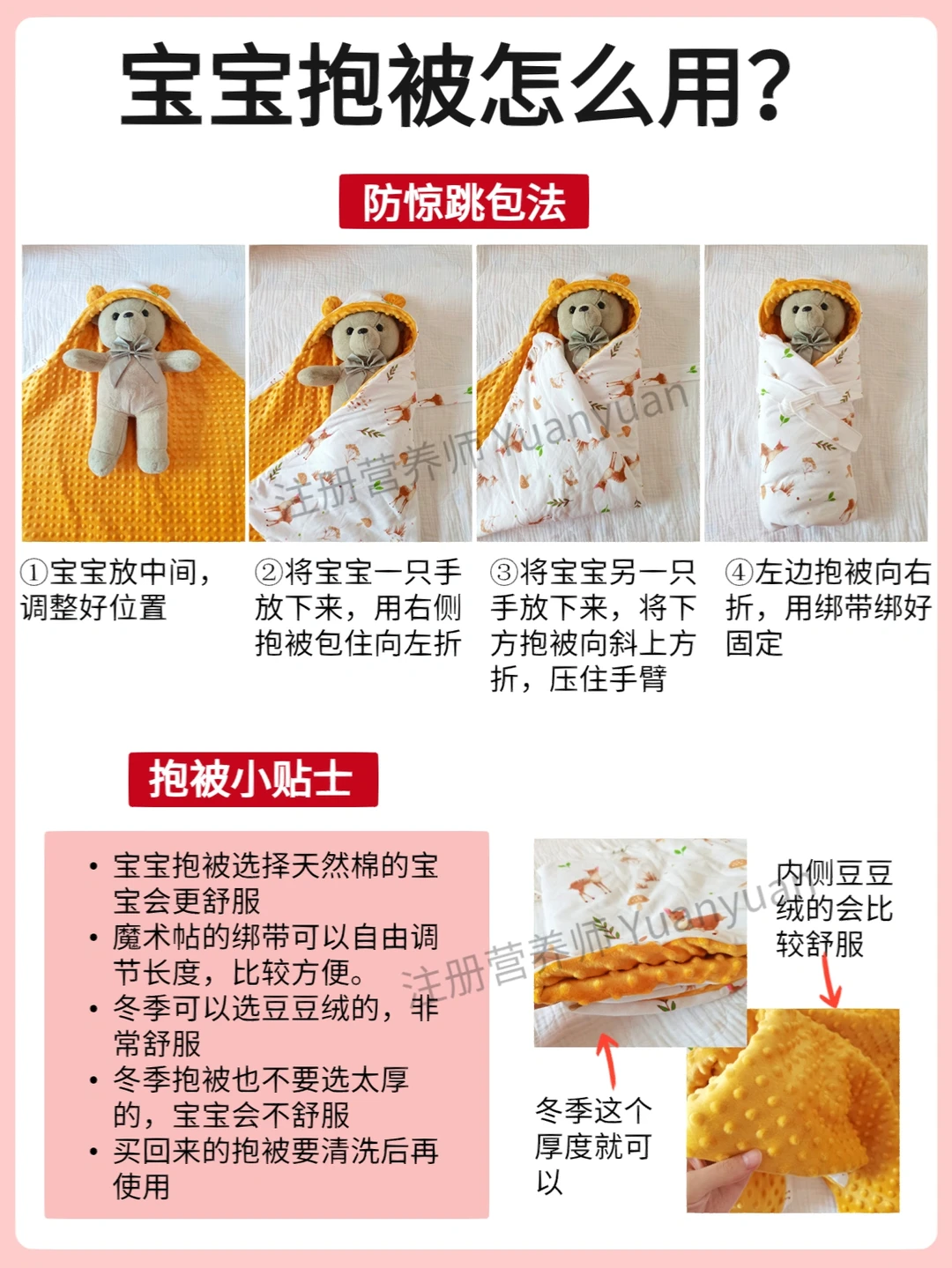 宝宝抱被买回来要清洗后再使用,我买过5-6个抱被,也踩过很多坑。建议大家我选用的这种外侧天然棉,内侧豆豆绒抱被,贴身很舒服,而且用久了也不掉毛,不会被压瘪,还是魔术帖绑带能自由调节长度很方便。