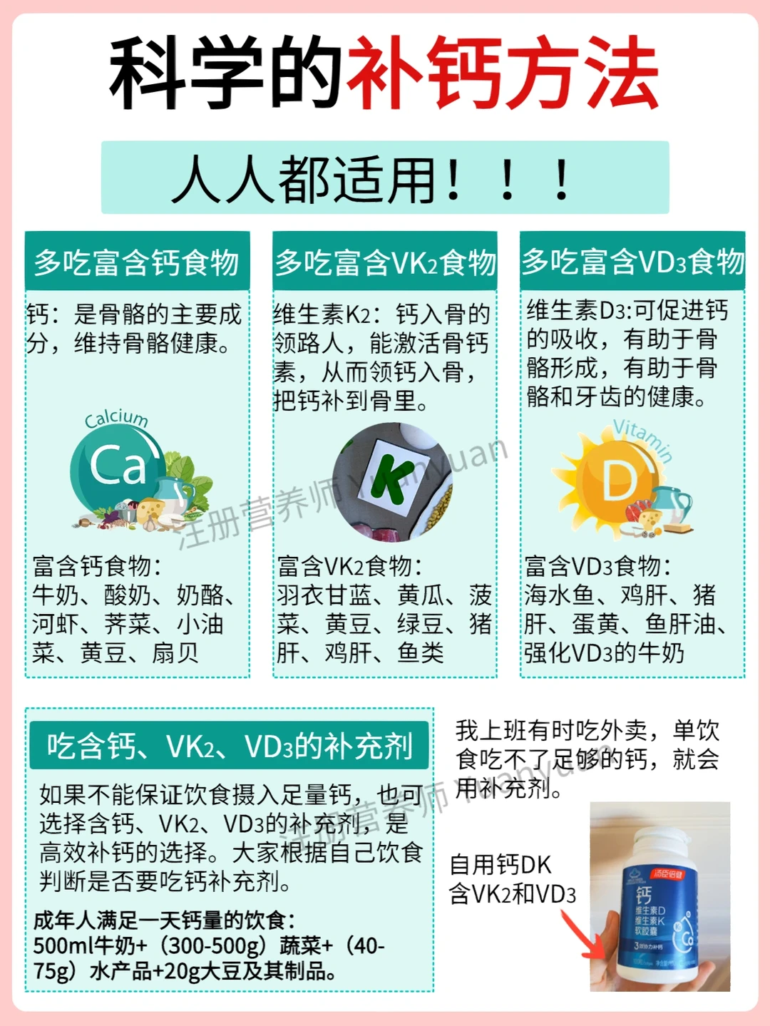 👉如果不能保证饮食摄入足量钙,也可选择含钙、VK2、VD3的补充剂。