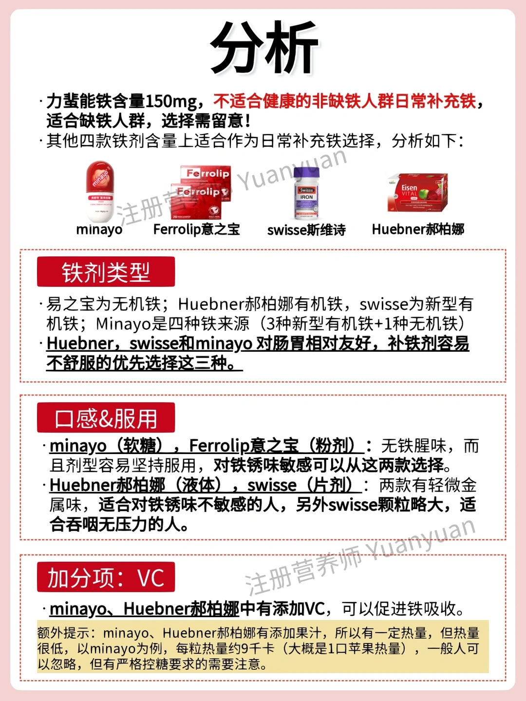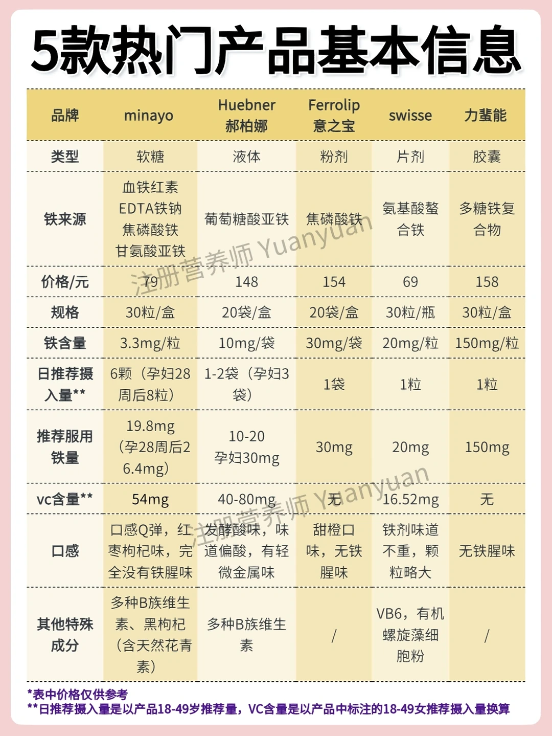 👉本次分析产品:minayo富铁软糖,Huebner郝柏娜补铁果汁, Ferrolip意之宝补铁粉, swisse补铁片,力蜚能多糖复合铁。