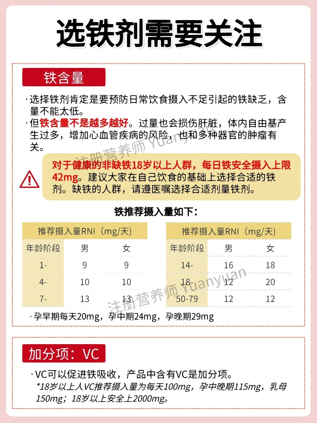 🔺铁含量要合适:不能太少,也不是越多越好。18岁以上成年人每日铁安全摄入上限42mg。建议大家在自己饮食的基础上选择合适的铁剂。缺铁的人群,请遵医嘱选择合适剂量铁剂。
