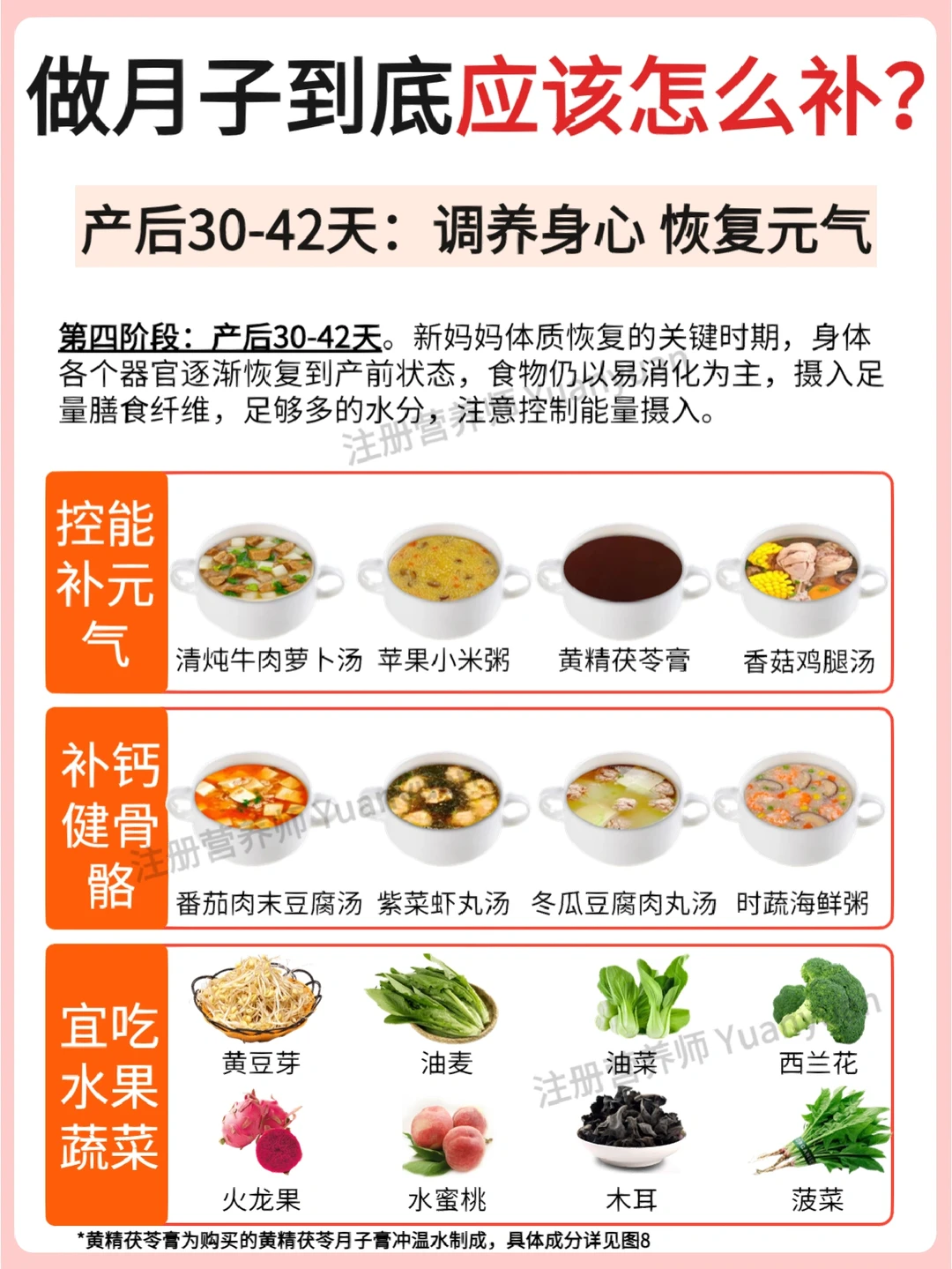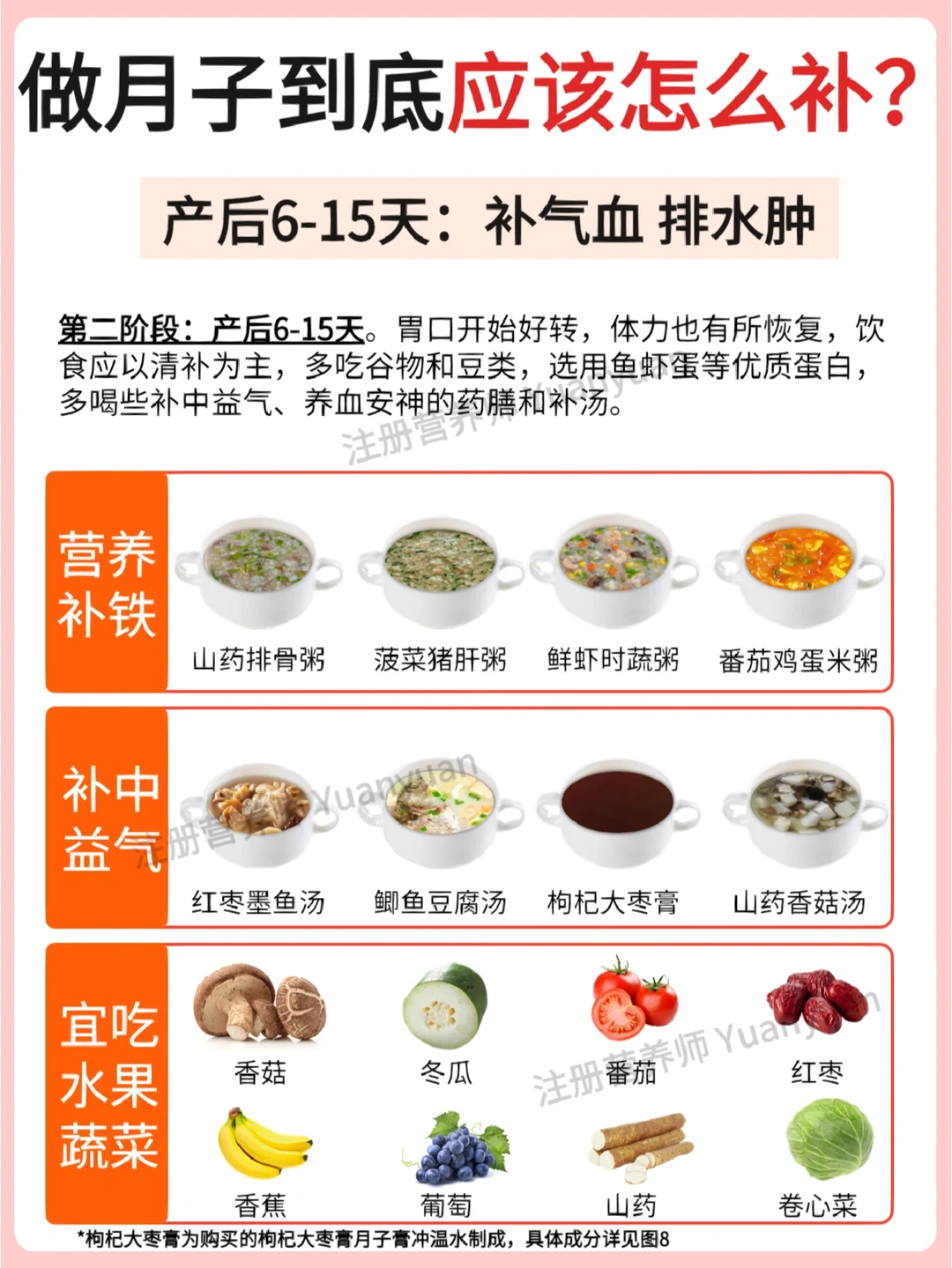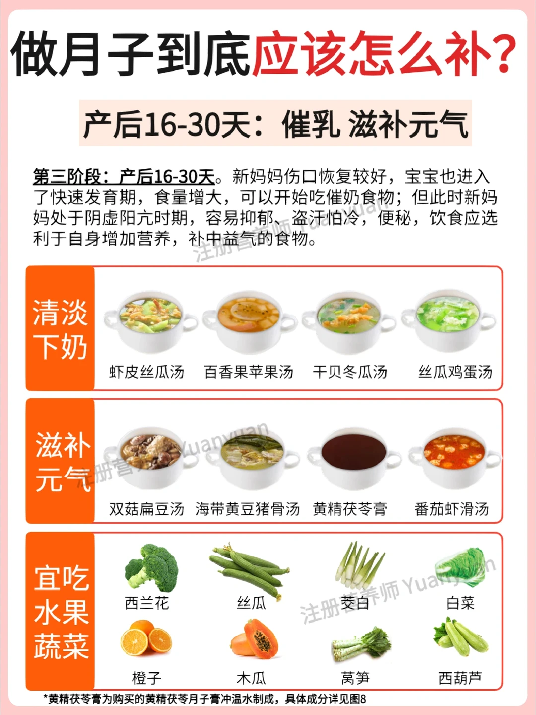 新妈妈在生产过程中消耗大量的体力,失血多,身体非常虚弱,在月子期间不仅要恢复自身生理功能,还要哺乳,所以月子饮食要格外注意,应根据生理变化按阶段调养,补充优质蛋白,铁、钙等营养,同时避免吃太多,造成营养过剩。