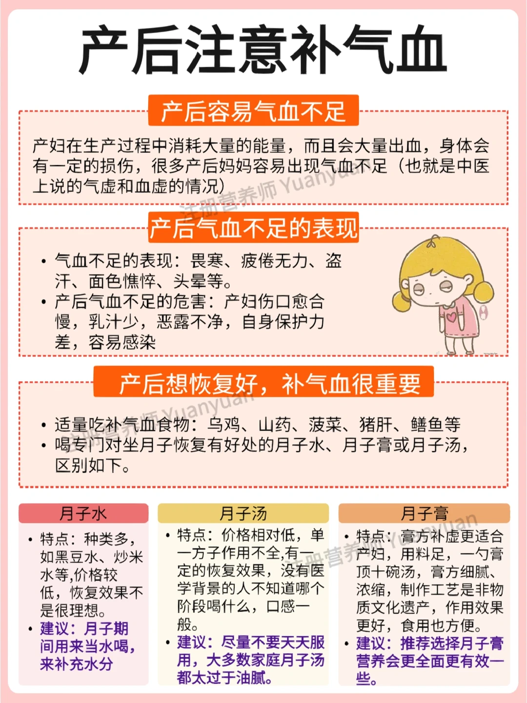 很多新妈妈容易出现气血不足,想要产后恢复好,补气血很重要,具体可从两点入手: