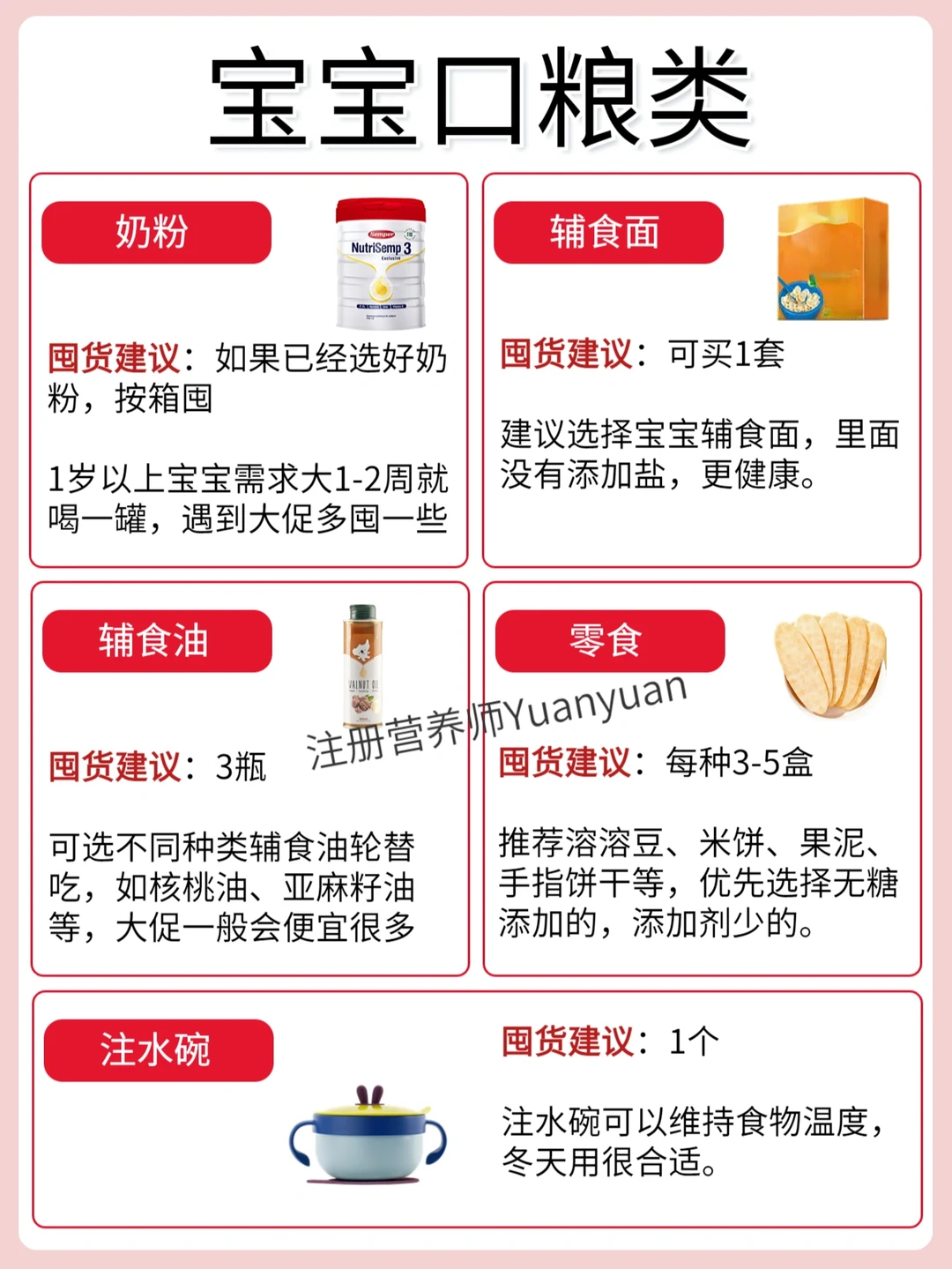 奶粉、面条、辅食油、零食(溶溶豆、米饼、果泥等)、辅食碗(双层可注水能保温)