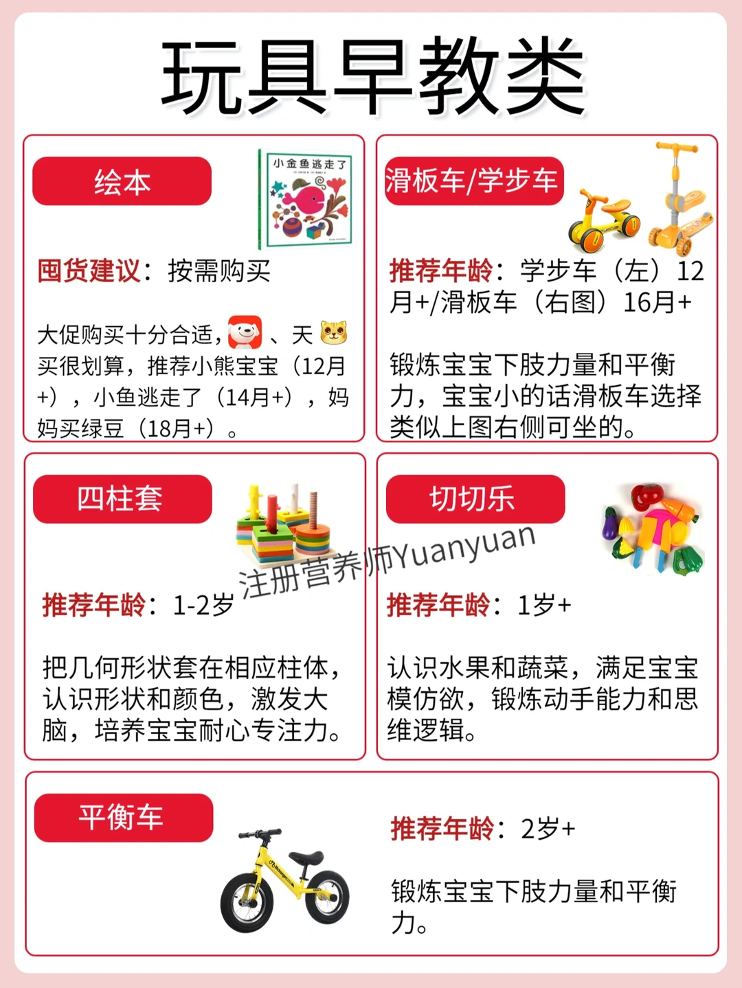 绘本、平衡车(2岁+适用)、滑板车/滑步车(1岁+适用)、四柱套(1岁+适用)、切切乐(1岁+适用)
