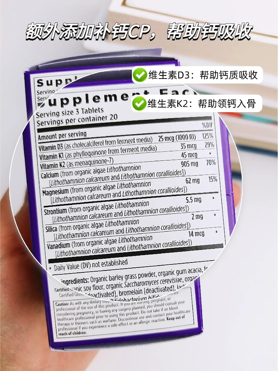 🔸优点:含钙量高,属于天然的植物钙源,相对碳酸钙更容易被吸收,并且可以空腹服用,对消化道不好的人同样友好,同时天然富含70+种骨骼所需的矿物质,给骨骼更全面的营养。