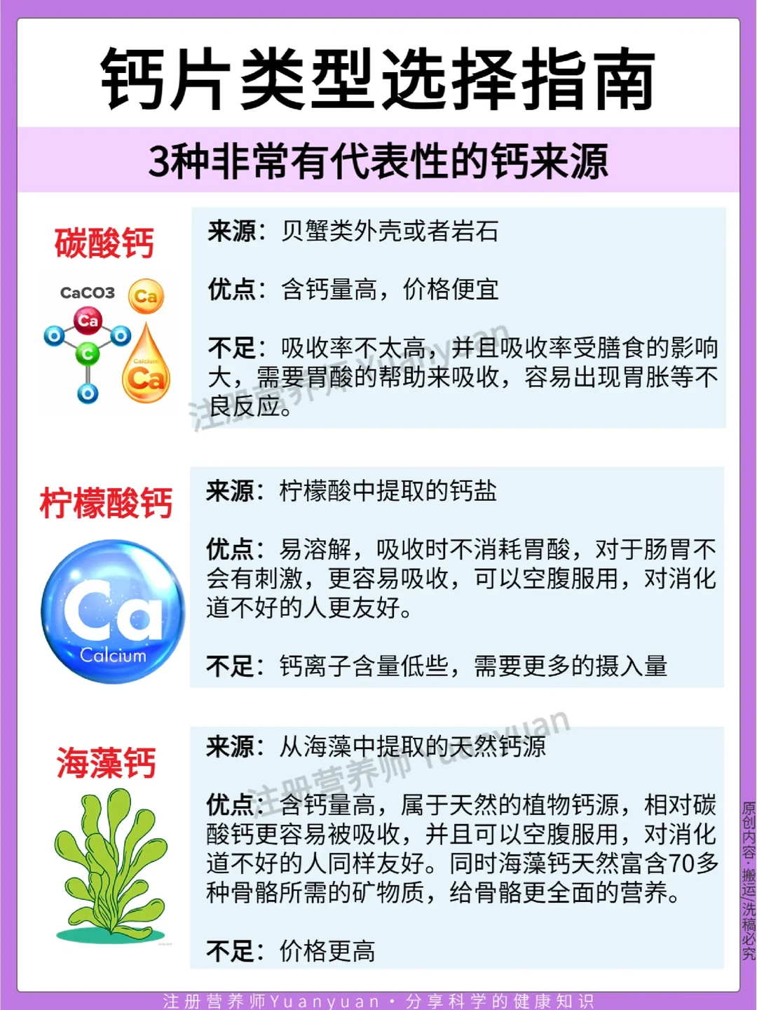 目前市面上的钙片根据钙来源分为合成钙和天然钙。碳酸钙、柠檬酸钙、海藻钙是其中很有代表性的钙片。