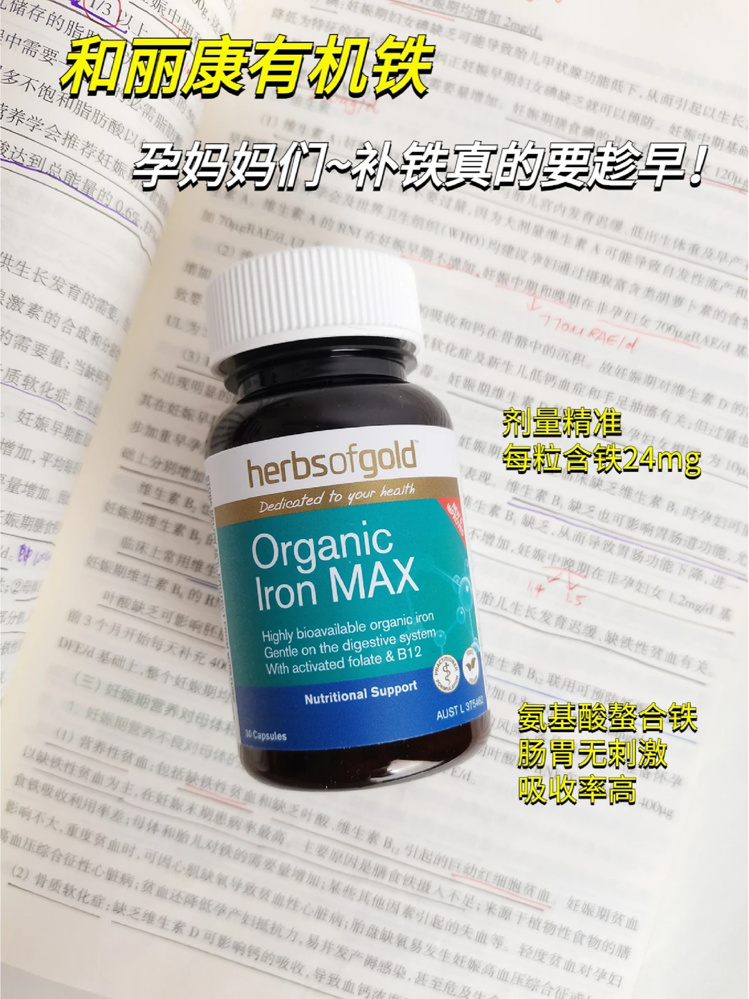 🔅从铁剂的形式来说它是氨基酸螯合铁,属于新型有机铁,吸收率会比其他形式的铁剂高,每粒铁含量24mg,不用担心铁超量导致的一些问题。