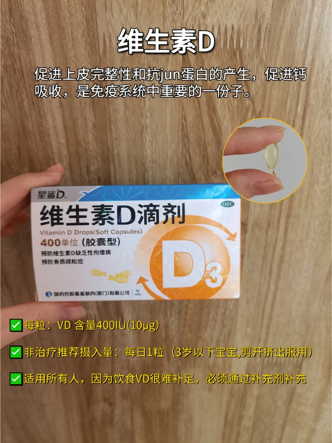 🔅 VD:维生素D滴剂,每粒400IU, 不易超量,日常非治疗性补充,每天1粒,全家都能吃。