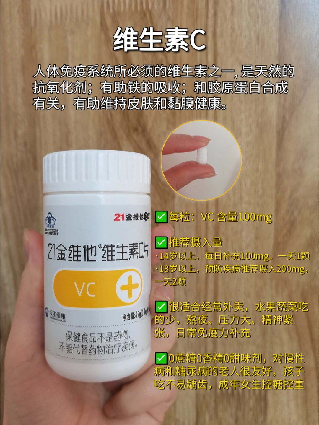 🔅 VC:21金维他维生素C片,每片100mg,不易超量(我国14岁以上推荐VC摄入是100mg,18岁以上提升保护力、预防疾病推荐摄入量200mg/天),3岁以上人群都能吃(孕妇和母乳妈妈也适用)。孩子、孕妈、母乳妈妈每天1片,成人可以每天2片。不含蔗糖、甜味剂、香精,配方简单,肾脏负担小,对慢性病和糖尿病的老人很友好,而且孩子吃不容易蛀牙。控糖控体重姐妹也很适合!