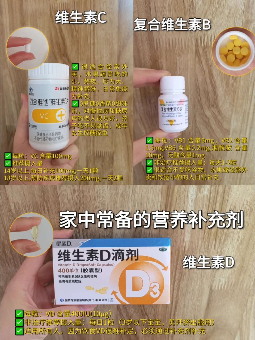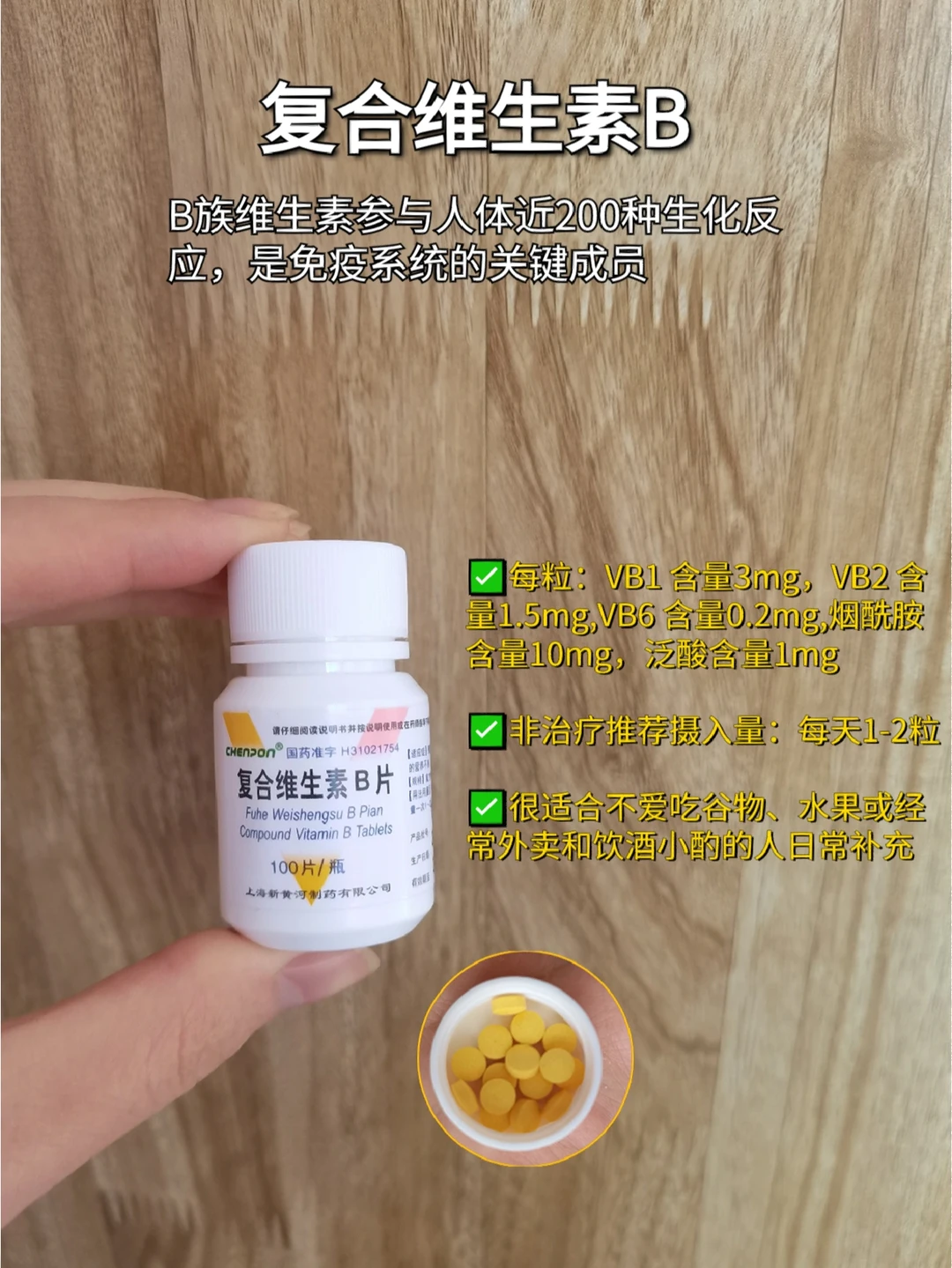 🔅 B族维生素:复合维生素B片,含VB1,VB2,VB6,烟酰胺,泛酸,日常非治疗性补充每天1-2粒,很适合不爱吃谷物、水果、饮酒小酌或经常外卖的人。