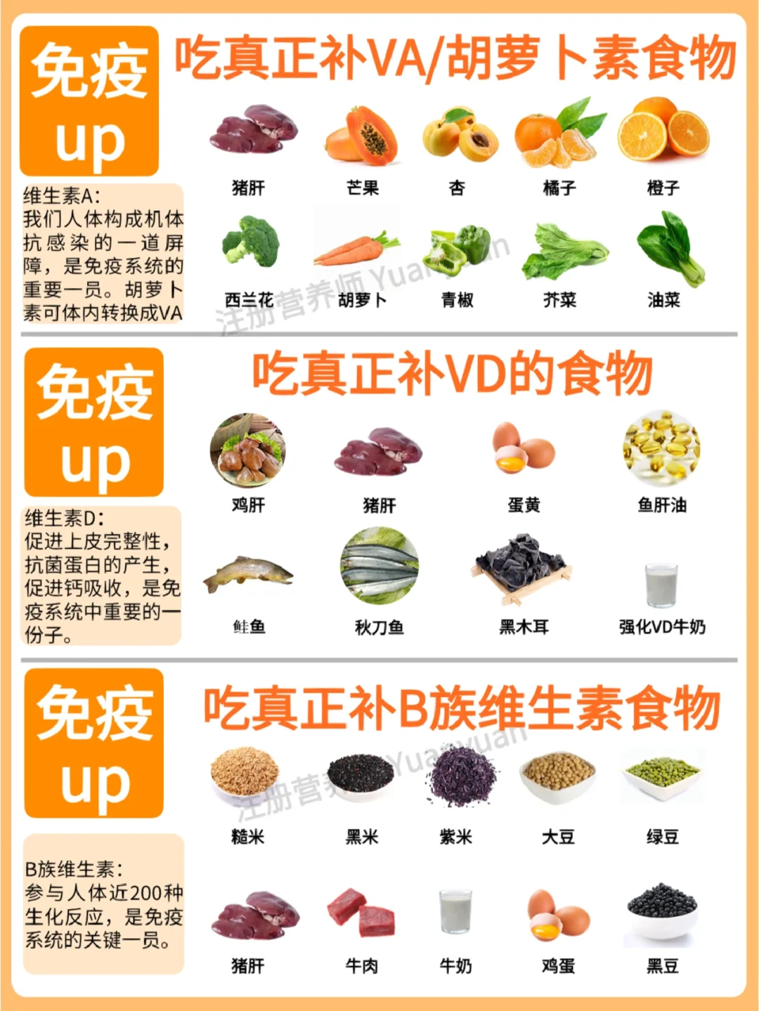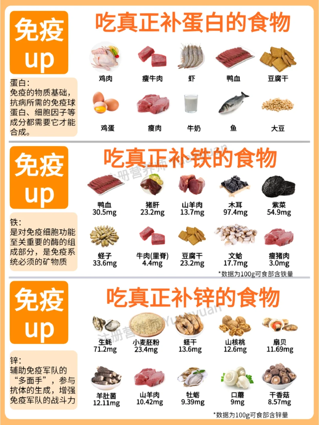 💪其实和免疫相关的营养有很多,比如:蛋白,VC/VD/VA、锌、铁等,我们可以通过日常膳食或者选择补充剂来补足这些营养,为身体免疫加油✨。