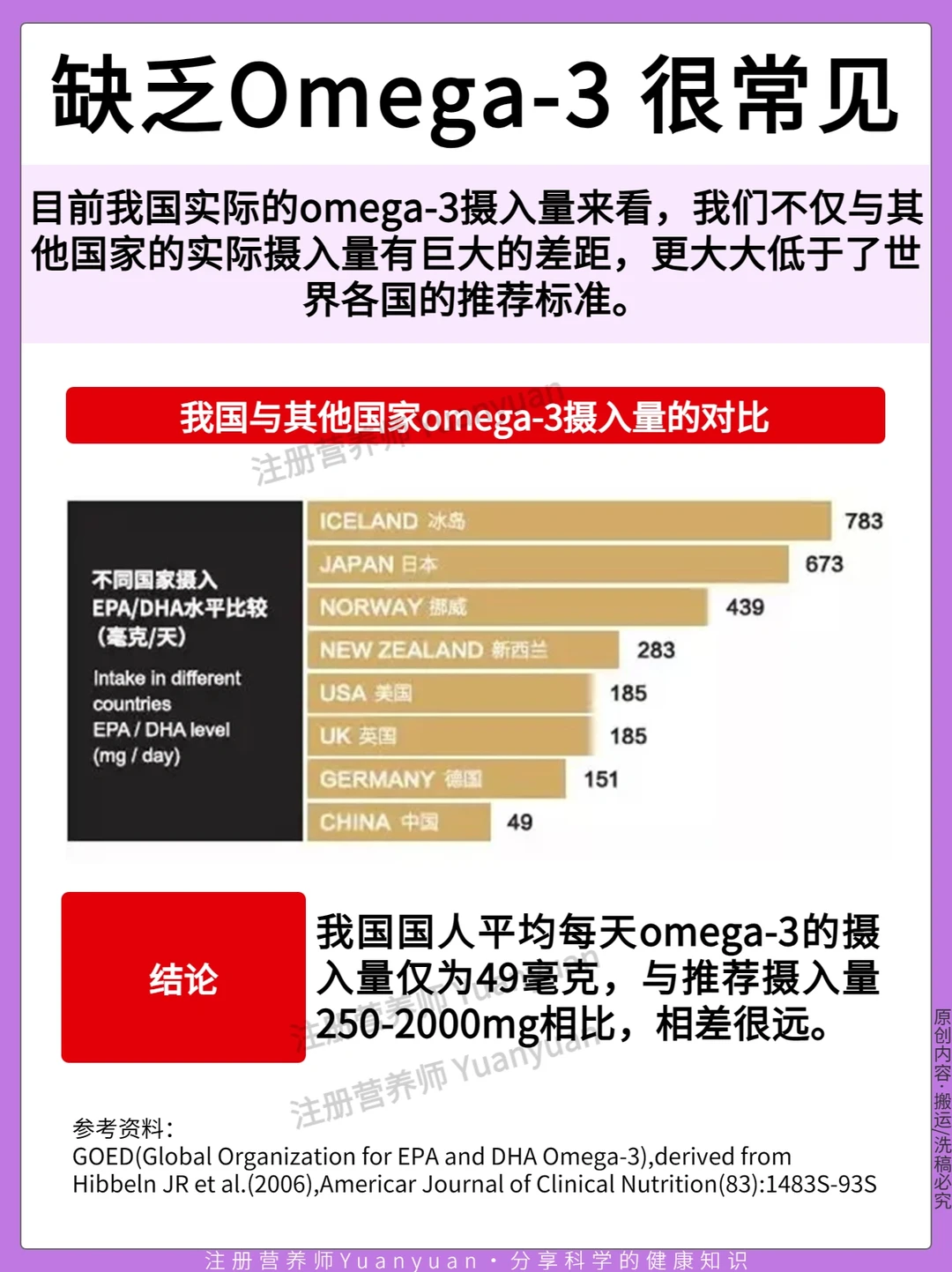 🎓要知道,omega-3脂肪酸是人体必需的营养素之一,每天的推荐摄入量250-2000mg,不过根据调查,国人每天omega-3的摄入量仅为49毫克/天。所以日常要多多吃富含omega3的食物。